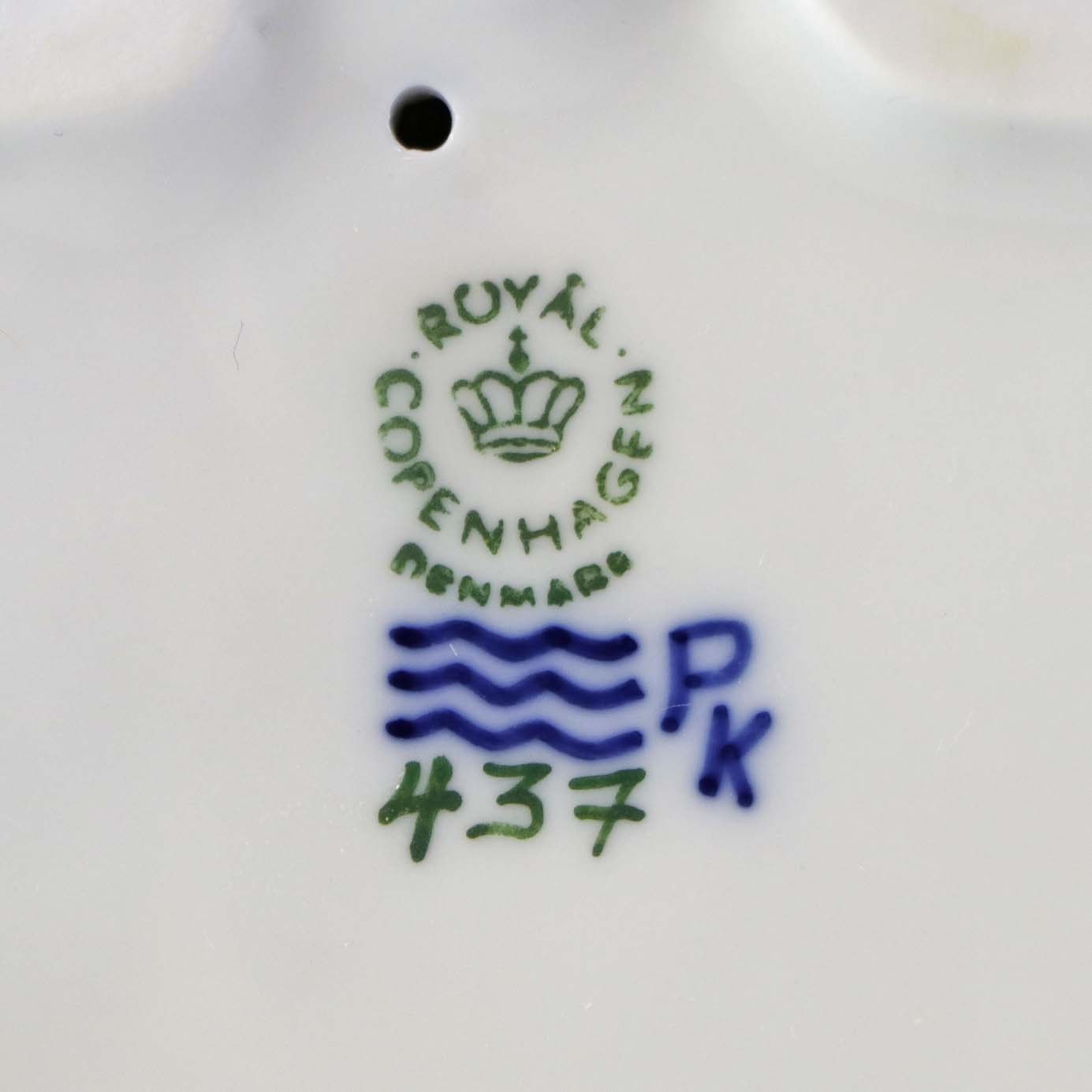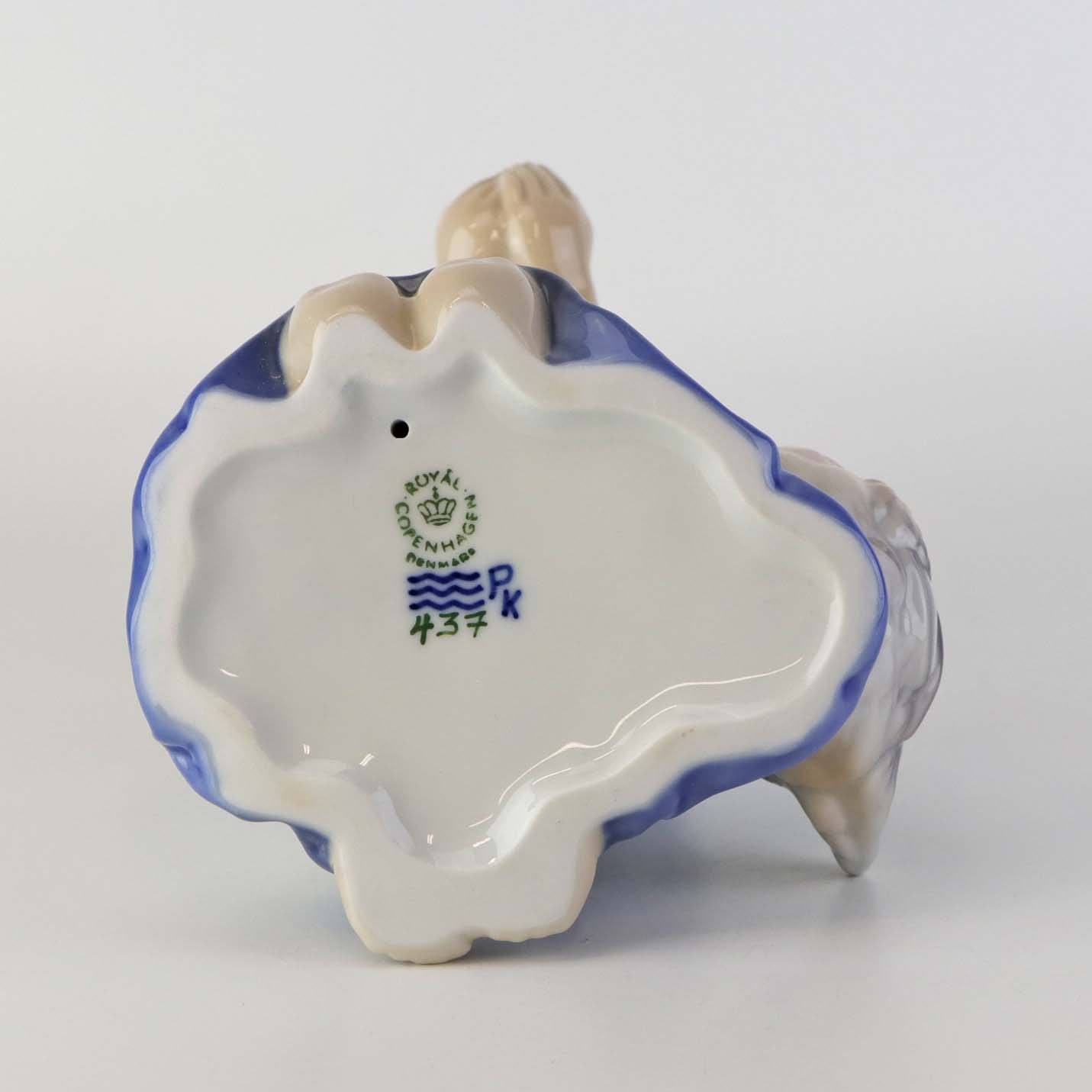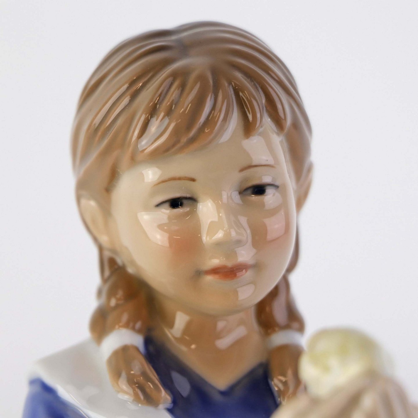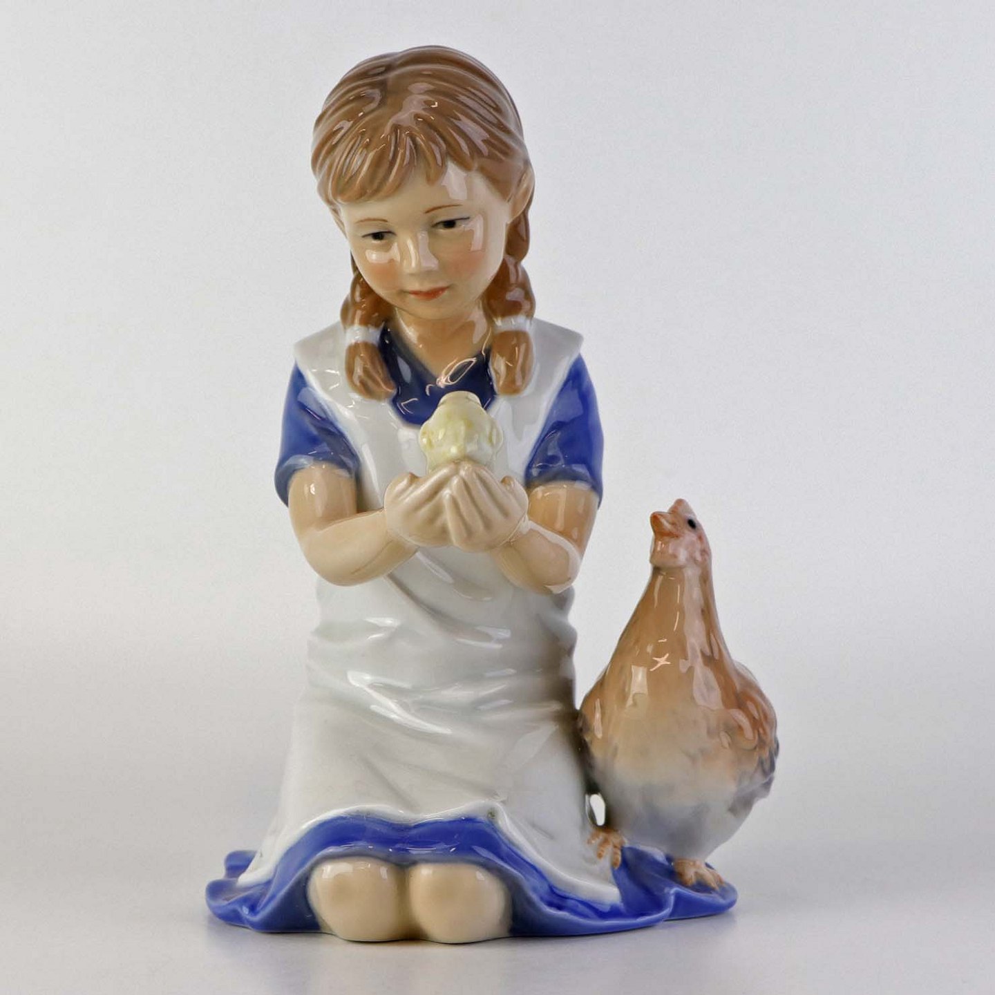 Figur i porcelæn med motiv af ung pige med en gul kylling i hænderne mens hønemor står ved siden af. Nr. 437