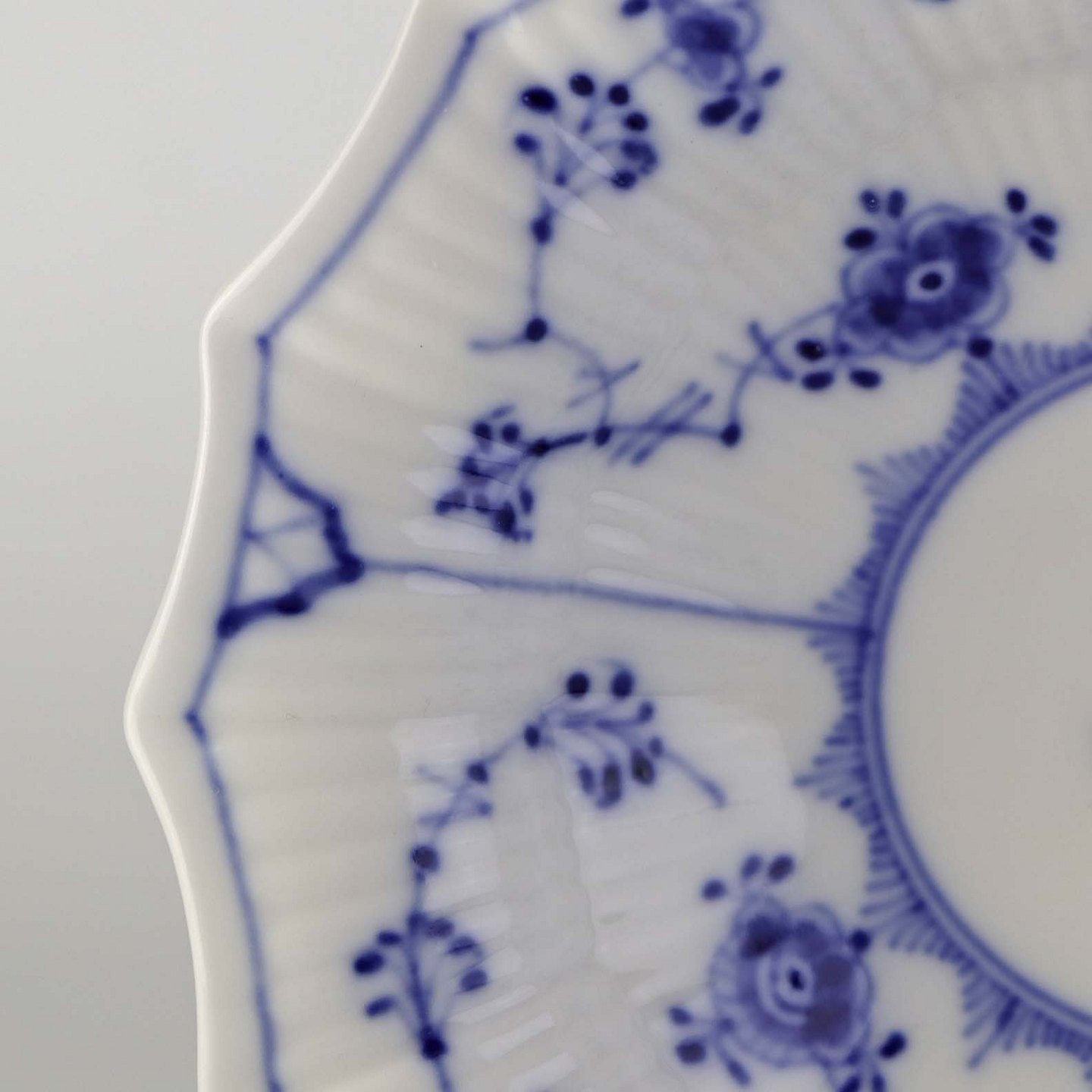 Musselmalet er af kongeligt hvidt porcelæn, dekoreret med rifler og mønster af blå ranker og blomster