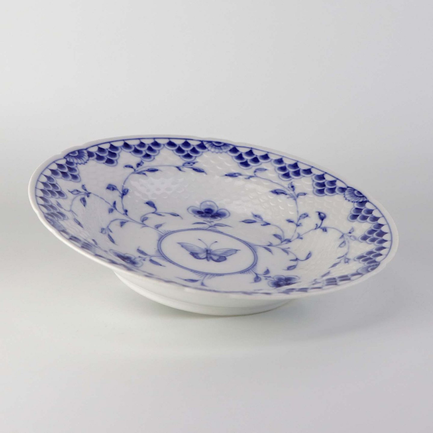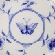 Tallerken i hvidt porcelæn med skelform dekoreret med blå motiver af ranker, blomster og sommerfugle.