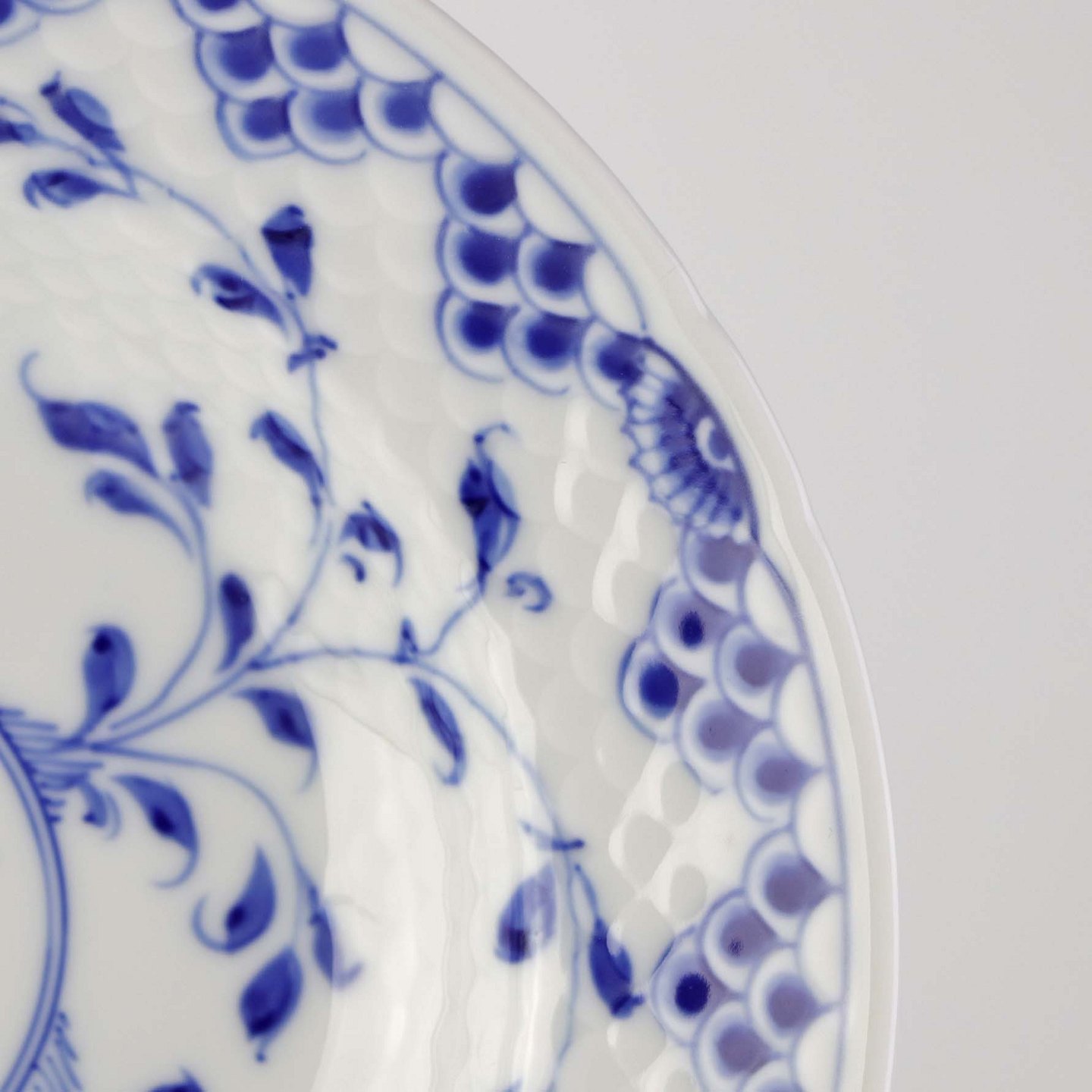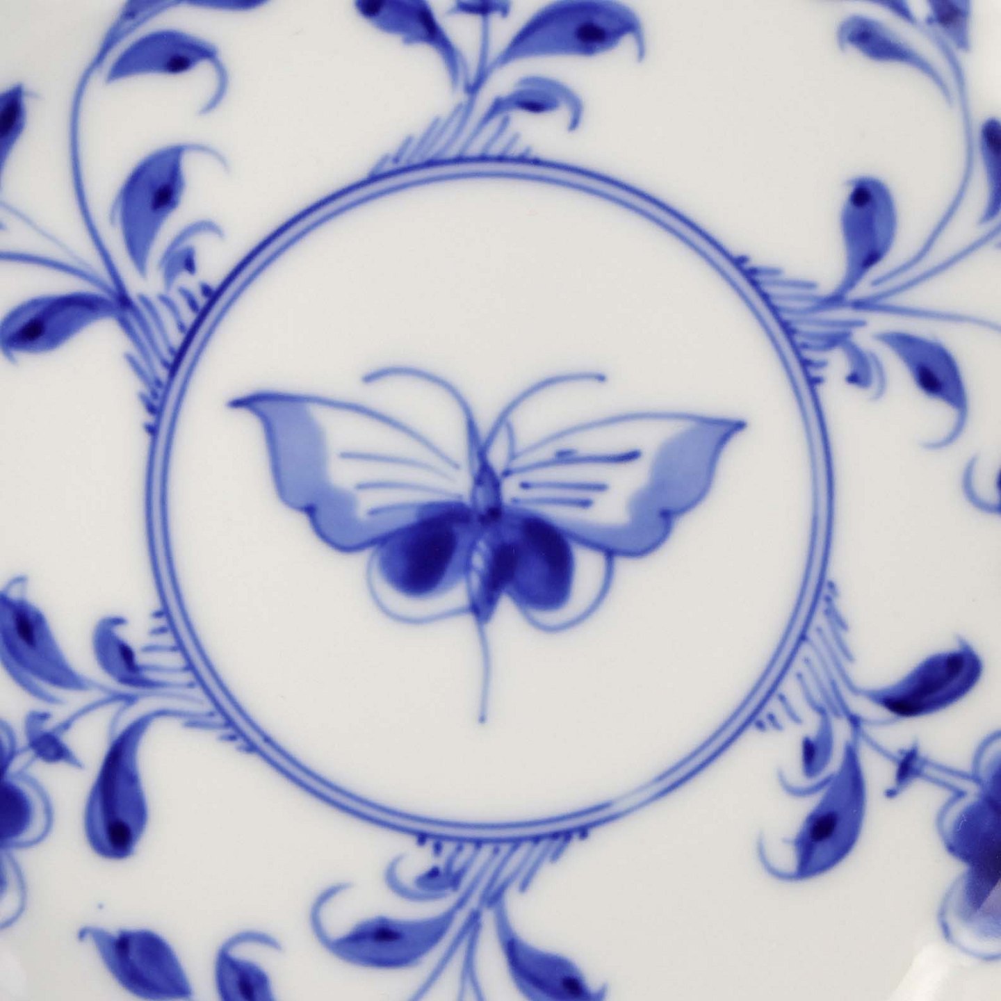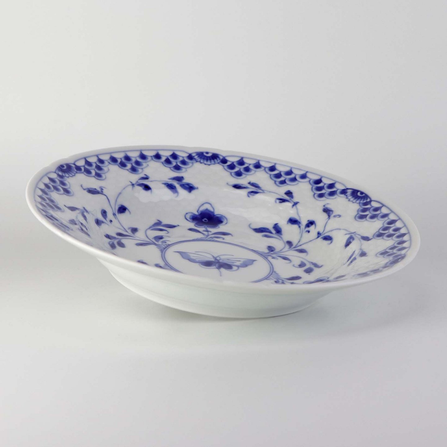 Tallerken i hvidt porcelæn med skelform dekoreret med blå motiver af ranker, blomster og sommerfugle.