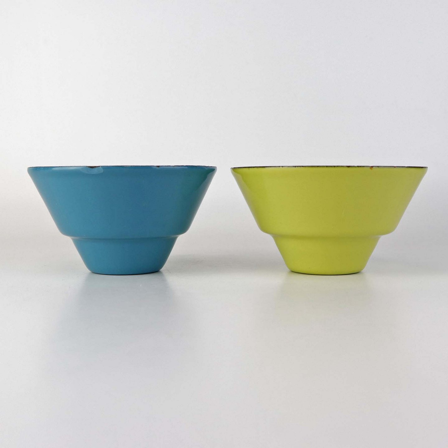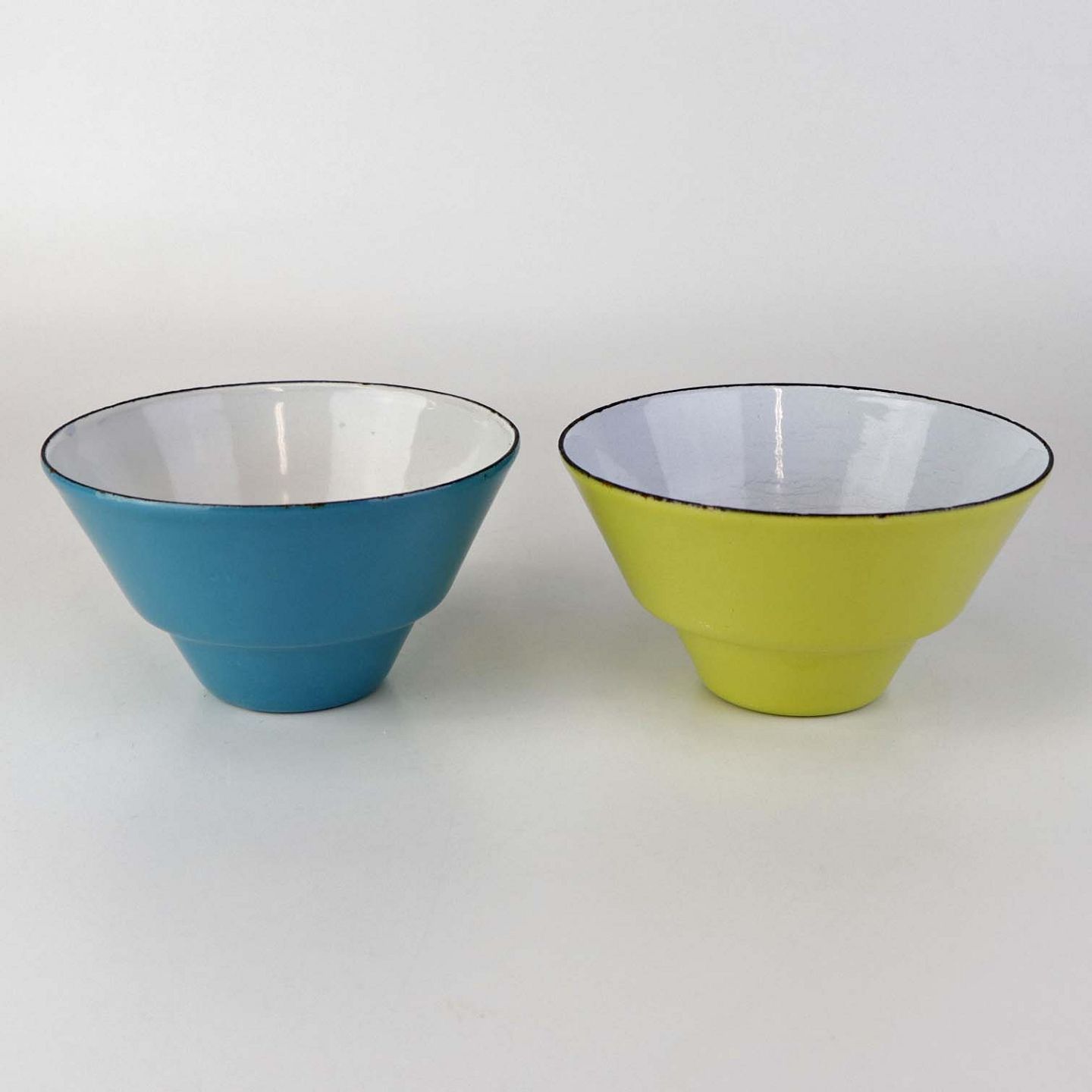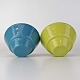 Et sæt med to mindre skåle i blå og limegrøn emalje med hvid emalje på indersiden. Model Treca