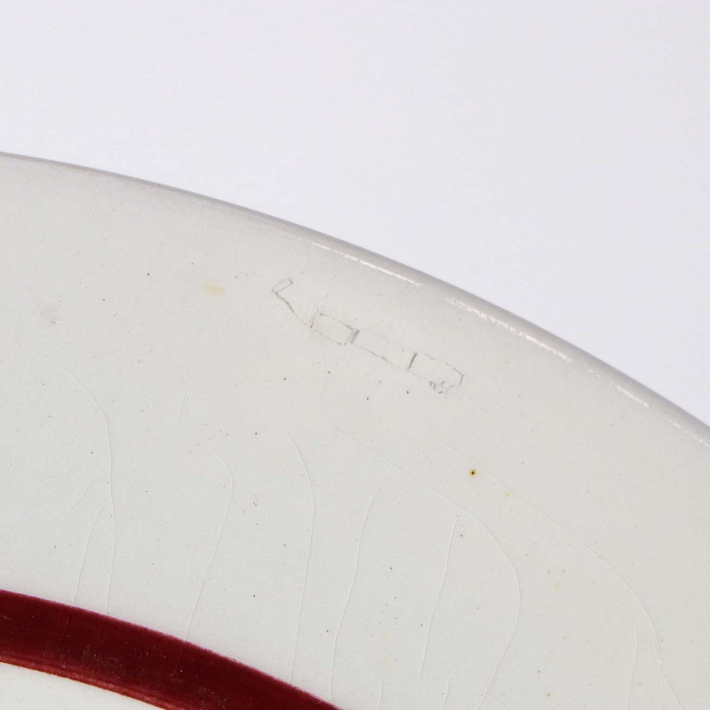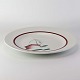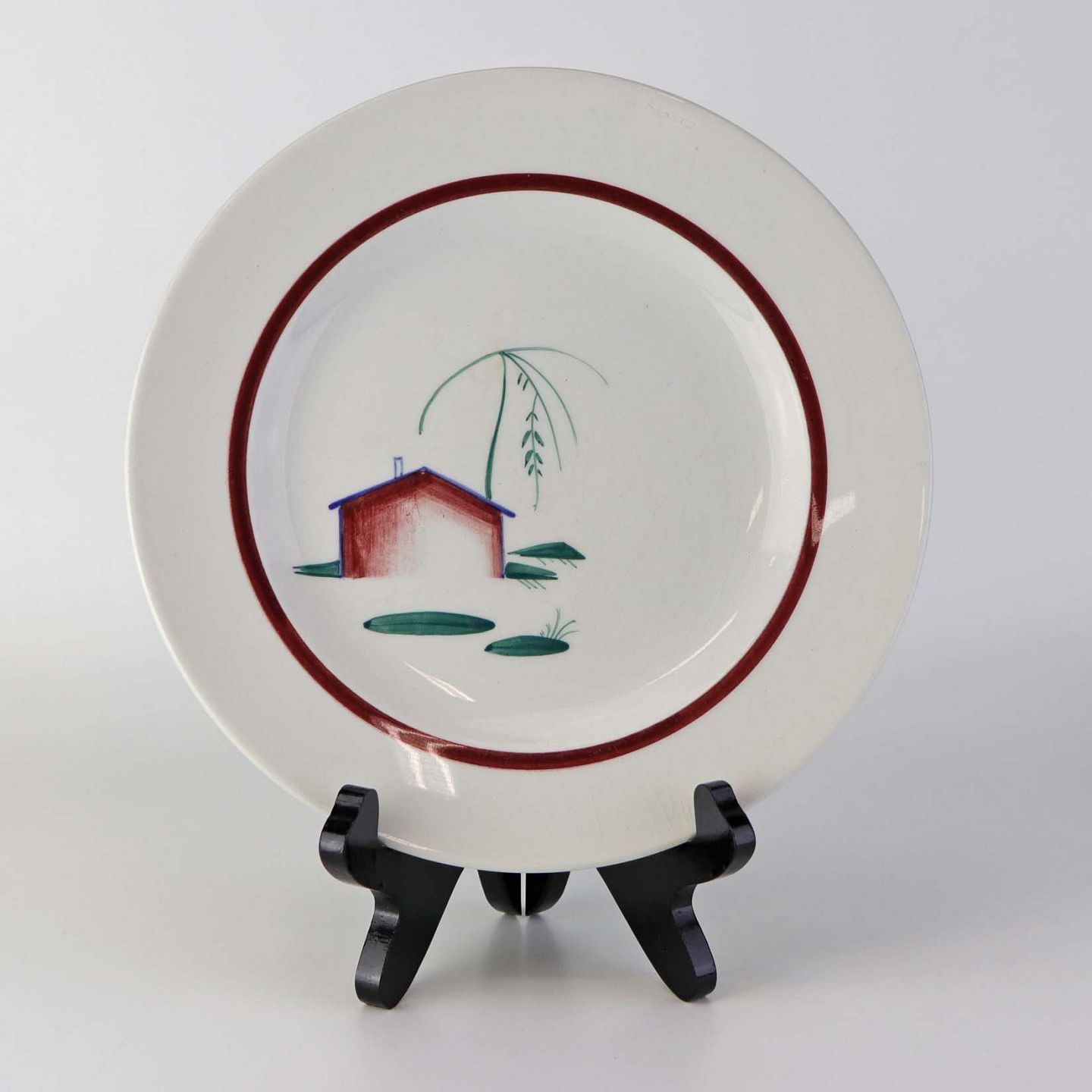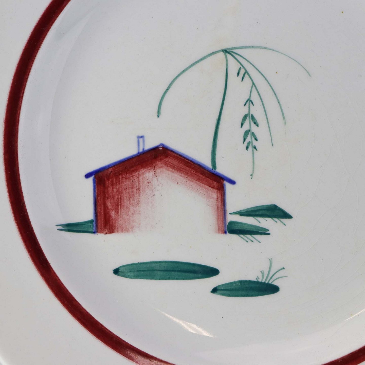 Flad tallerken i fajance navngivet Ålykke med motiv af grønt træ bag rødt hus.