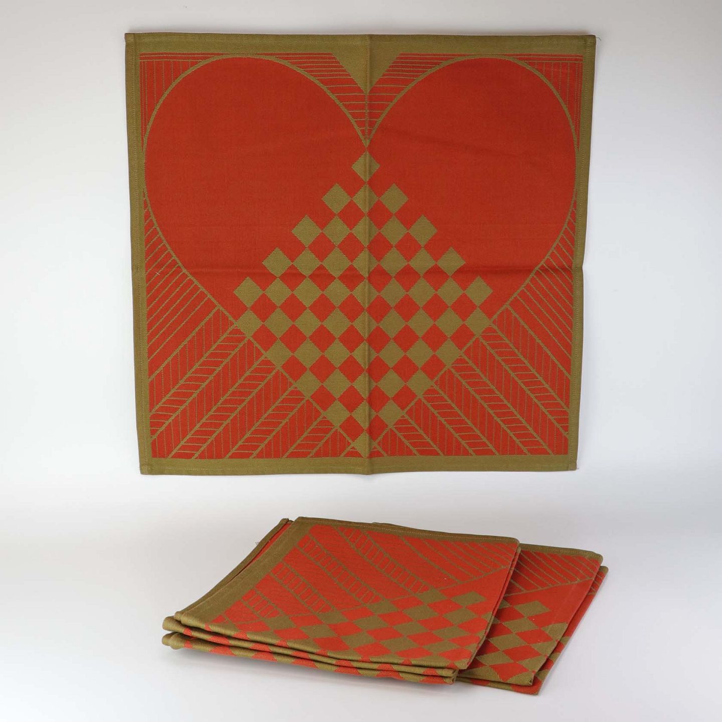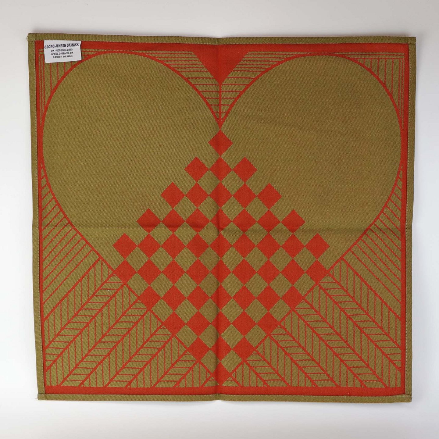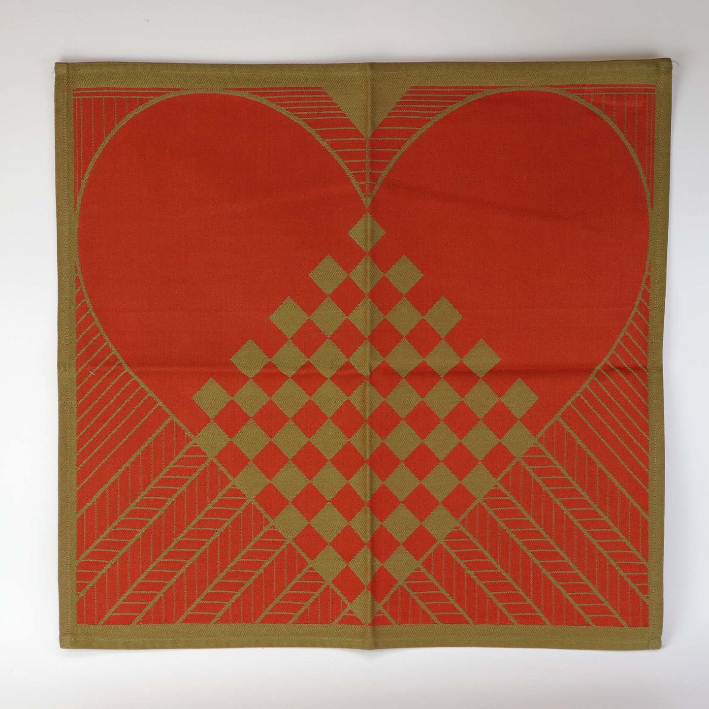 Et sæt med 6 styk servietter i vævet damask bomuld med motiv af flettede julehjerter i rød og grøn farve.