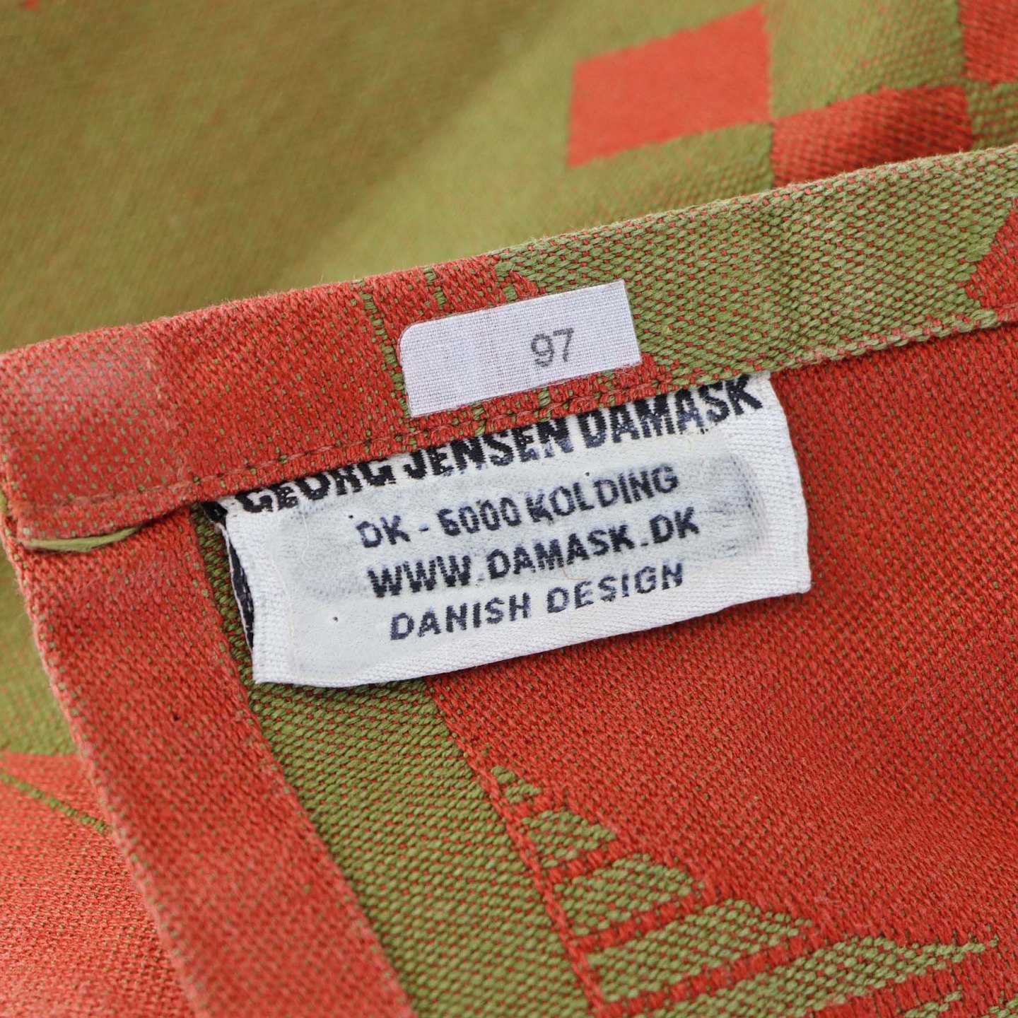 Vævet damask dug i bomuld med motiv af flettede julehjerter i rød og grøn farve.