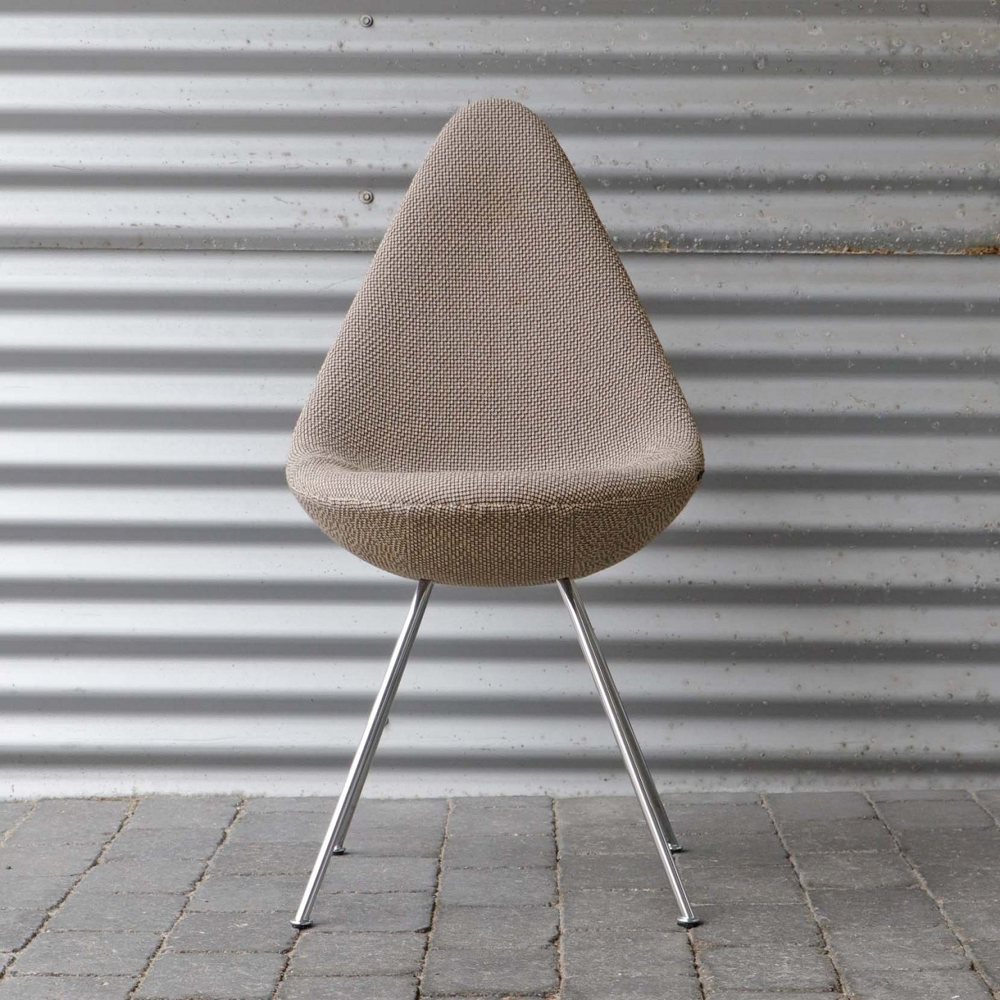 Spisebordsstol med ben i rustfrit stål og polstret sæde betrukket med struktureret stof i beige og sort. Model Dråben nr. 3110