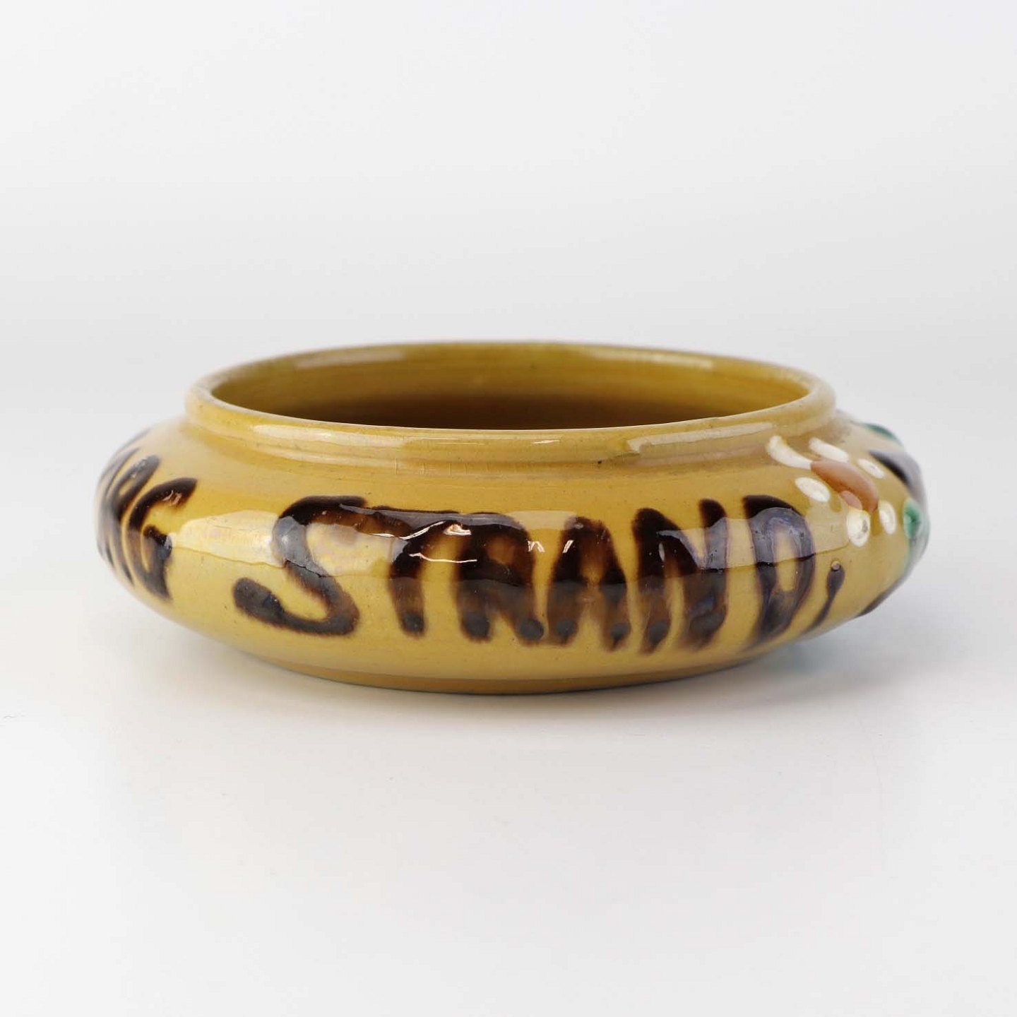Mindre skål i glaseret keramik med teksten Nyborg Strand og dekoration af blomster og blade.