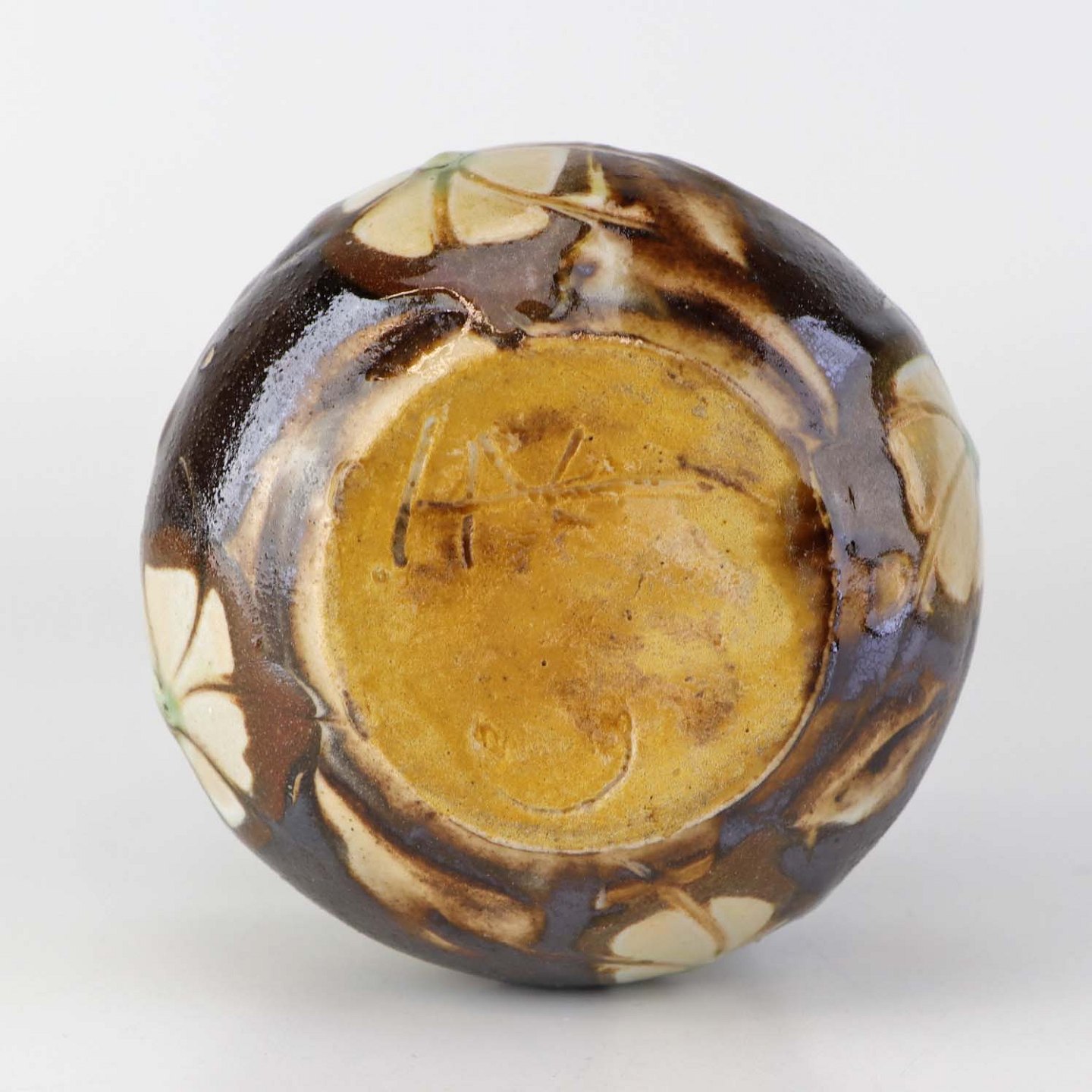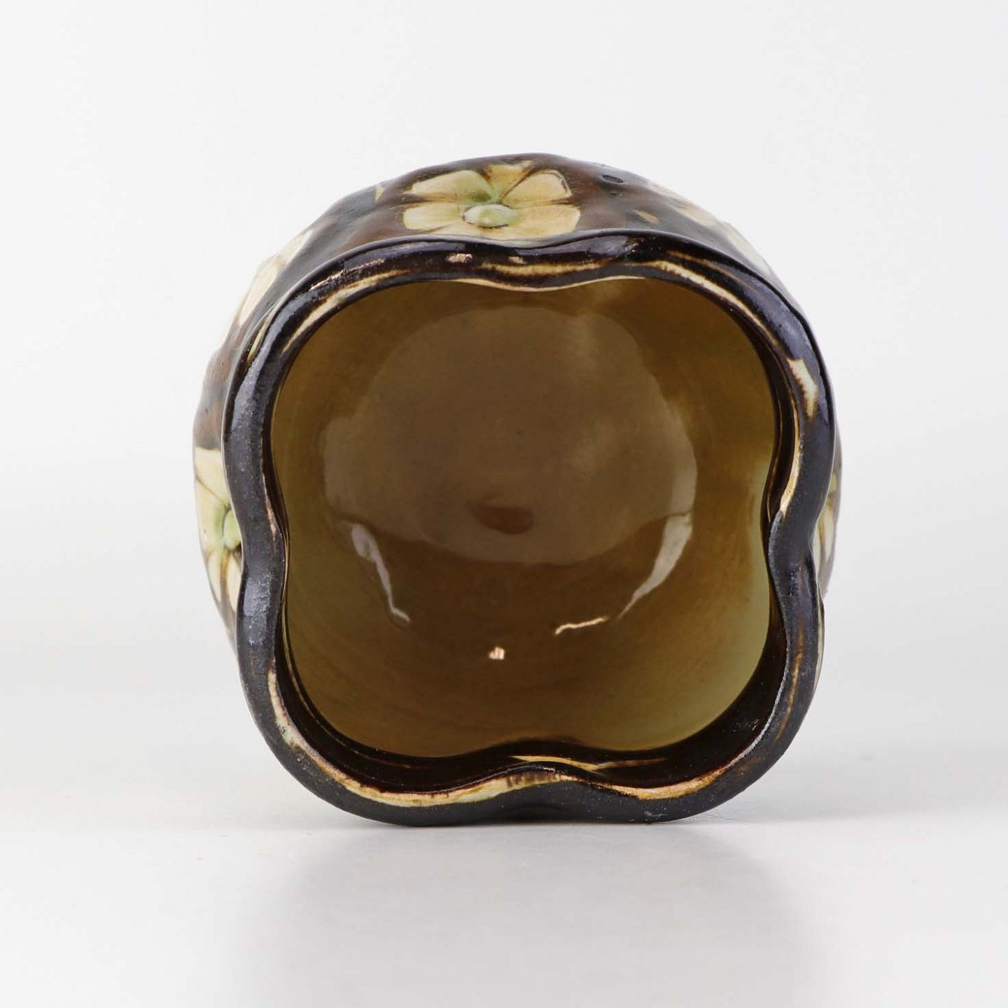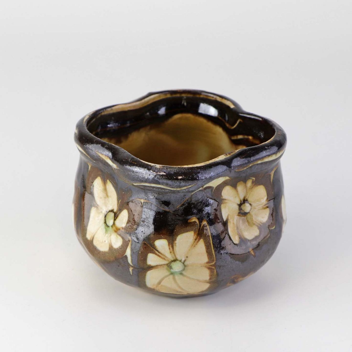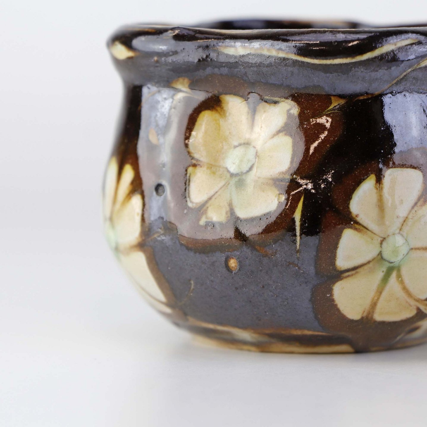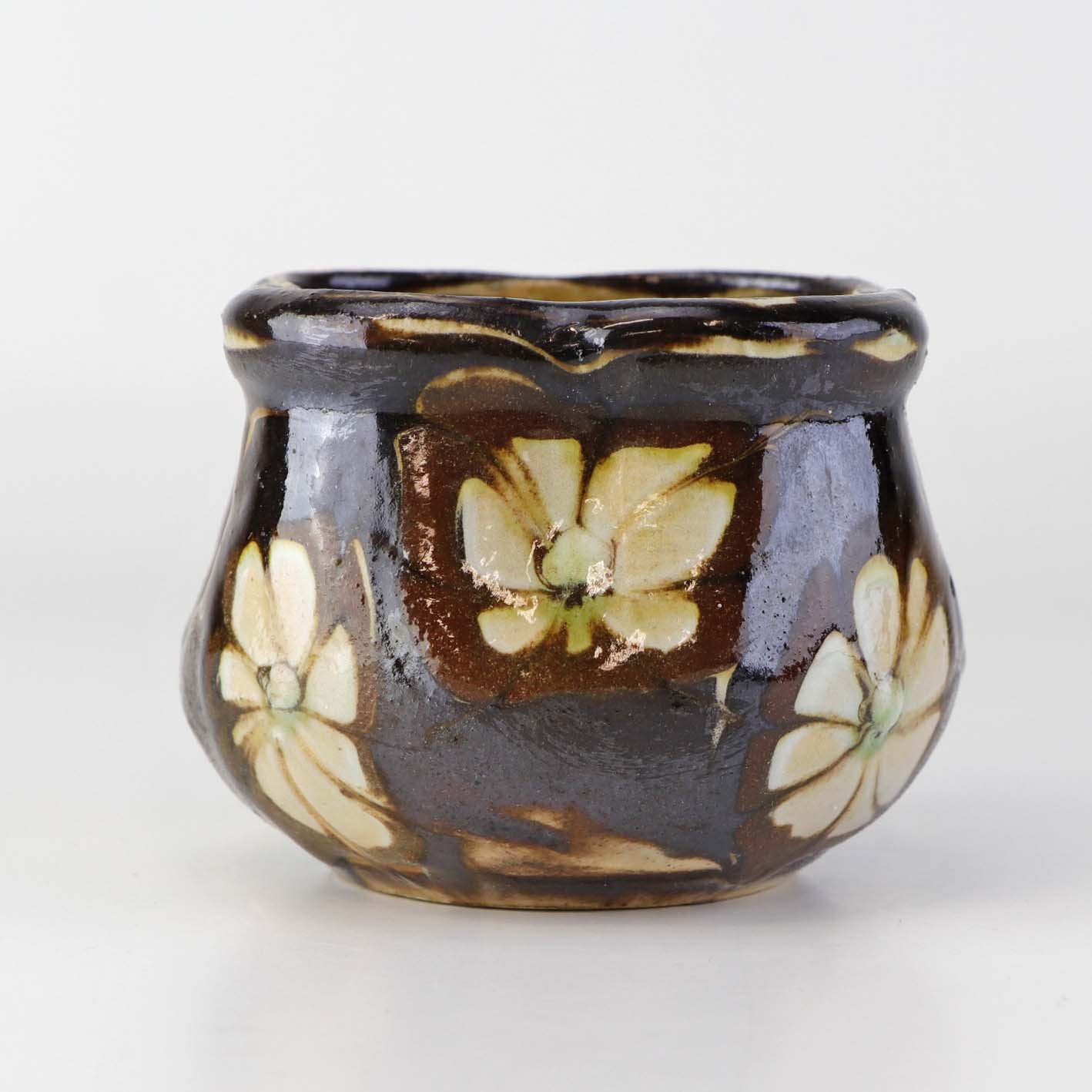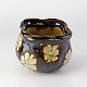 Mindre vase i glaseret keramik dekoreret med lyse blomster på brun baggrund.