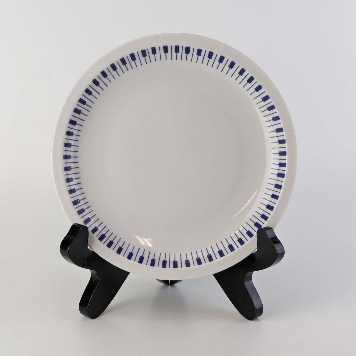 Stellet er fremstillet i ildfast glat porcelæn dekoreret med mørkeblå tangenter på hvid baggrund.