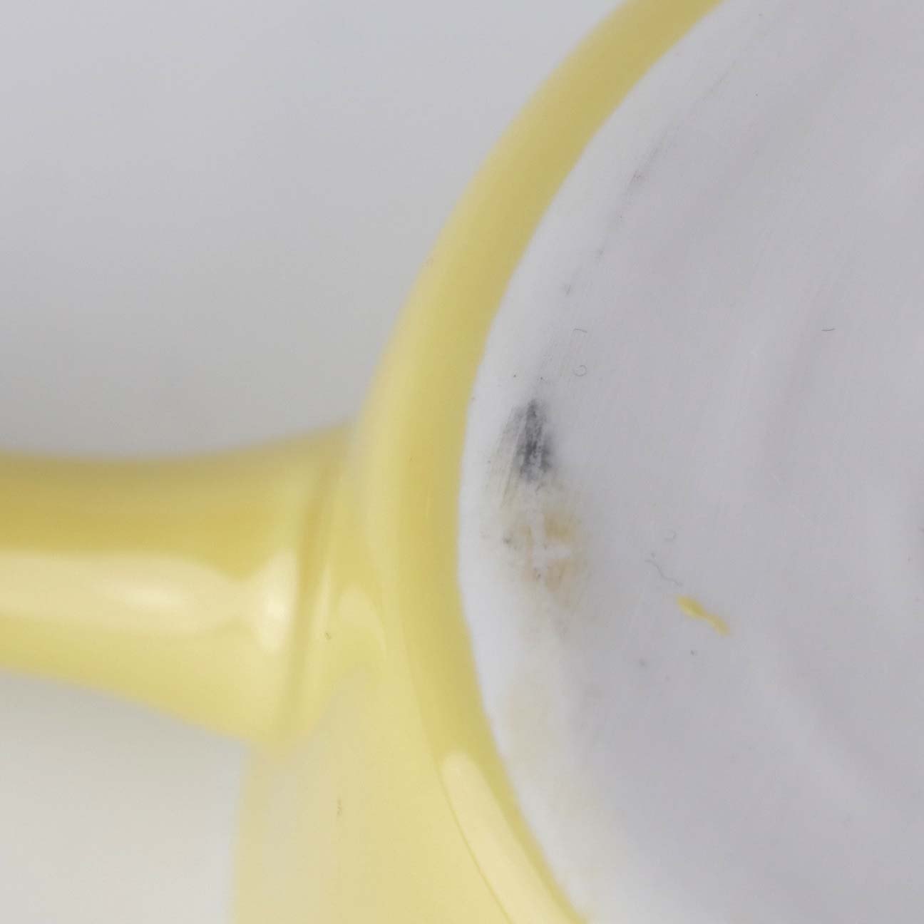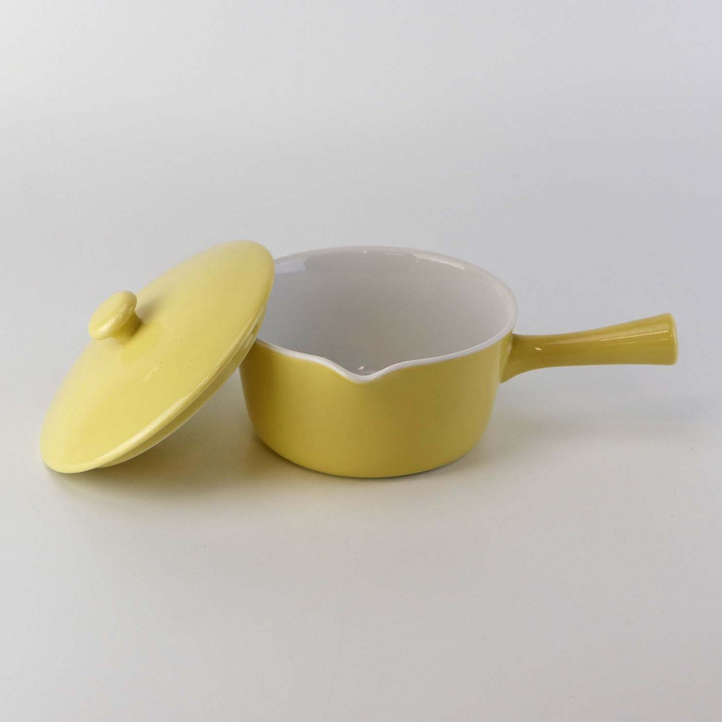 Stellet er fremstillet i ildfast glat porcelæn dekoreret med gul glaseret yderside og hvid glaseret inderside.