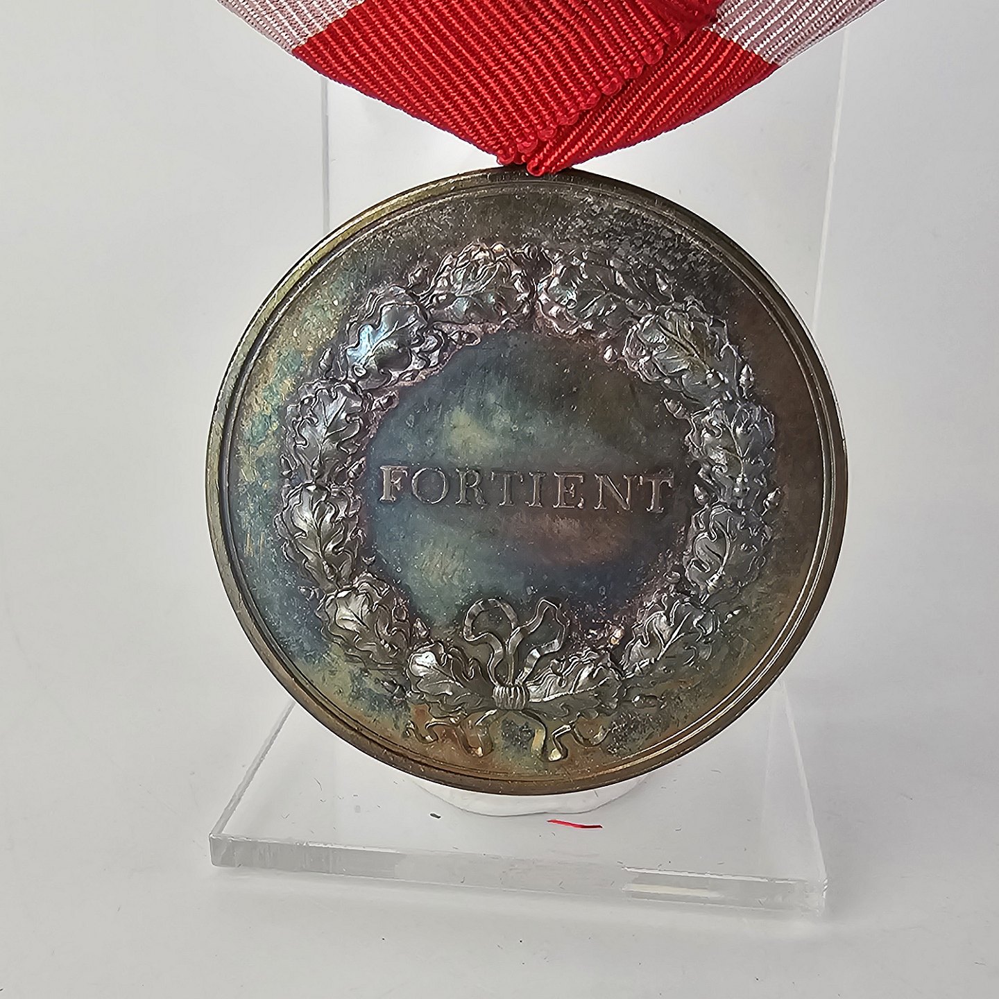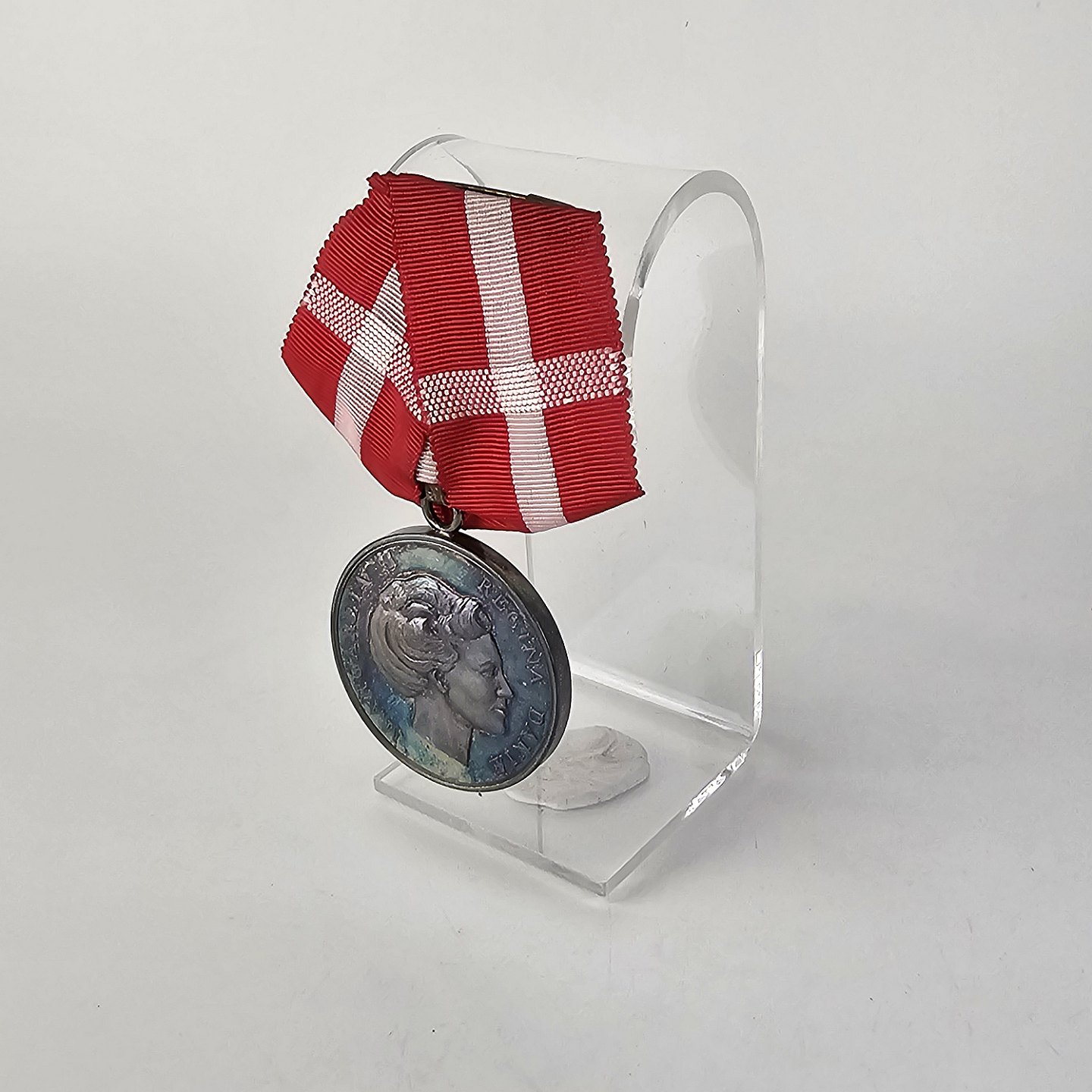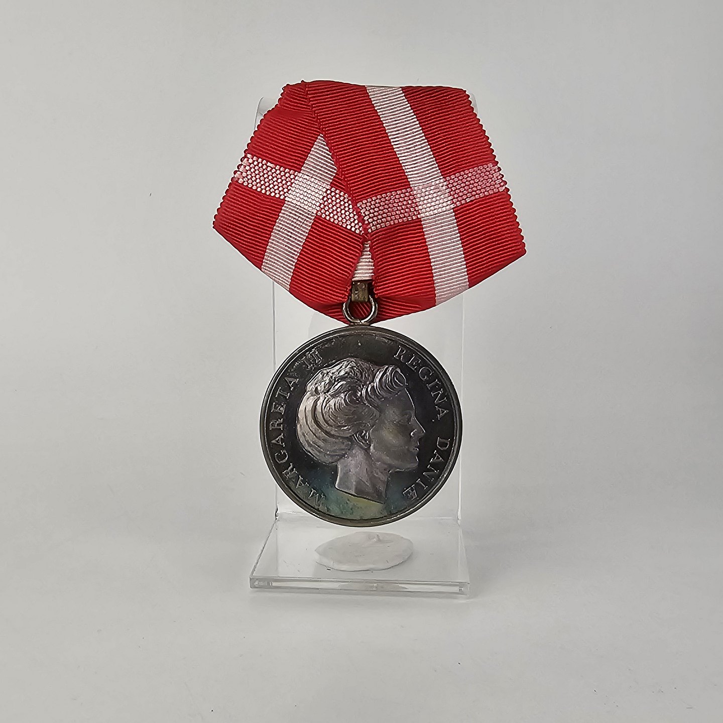 Fortjenstmedalje i sølv med teksten Margareta II Regina Danie på forsiden og Fortient på bagsiden