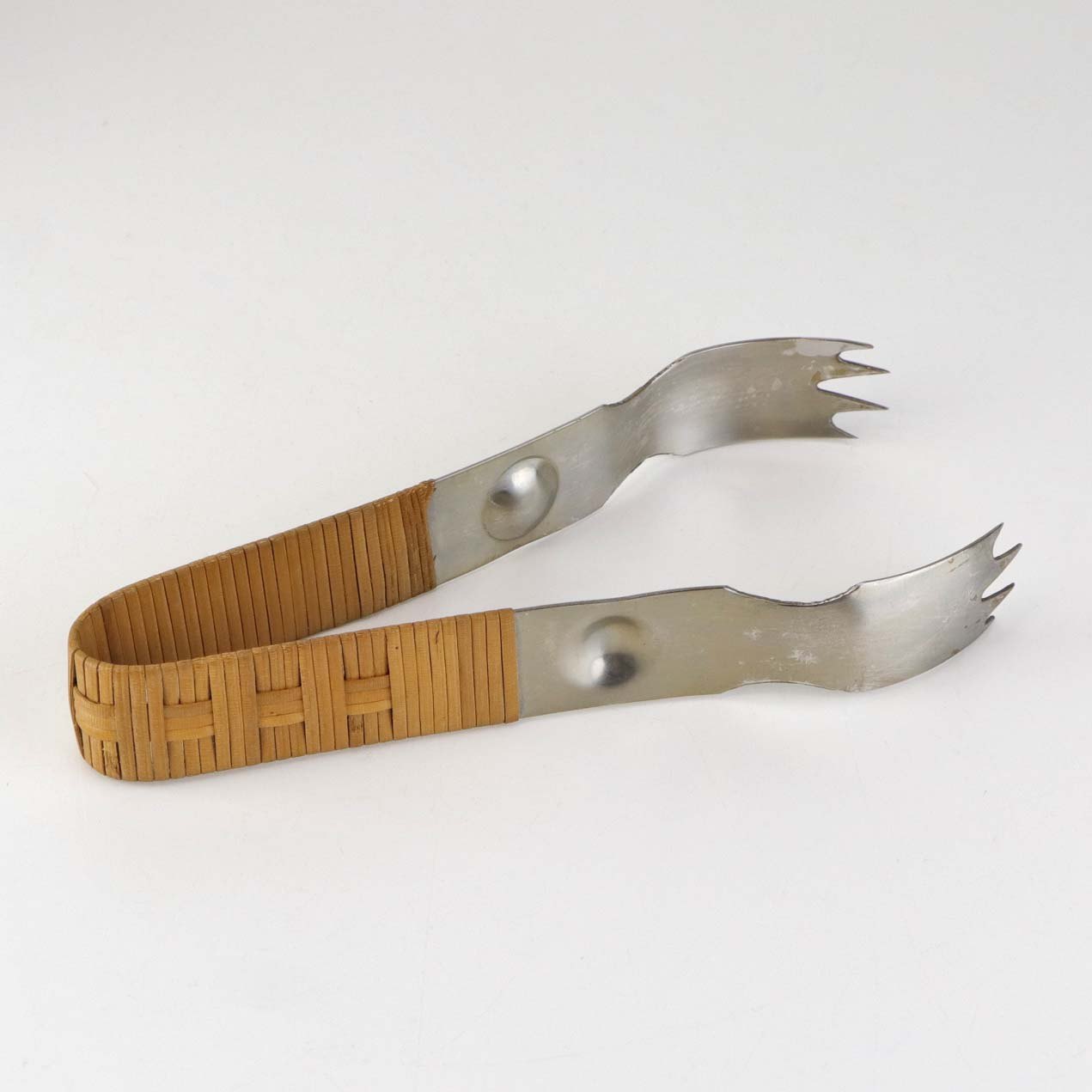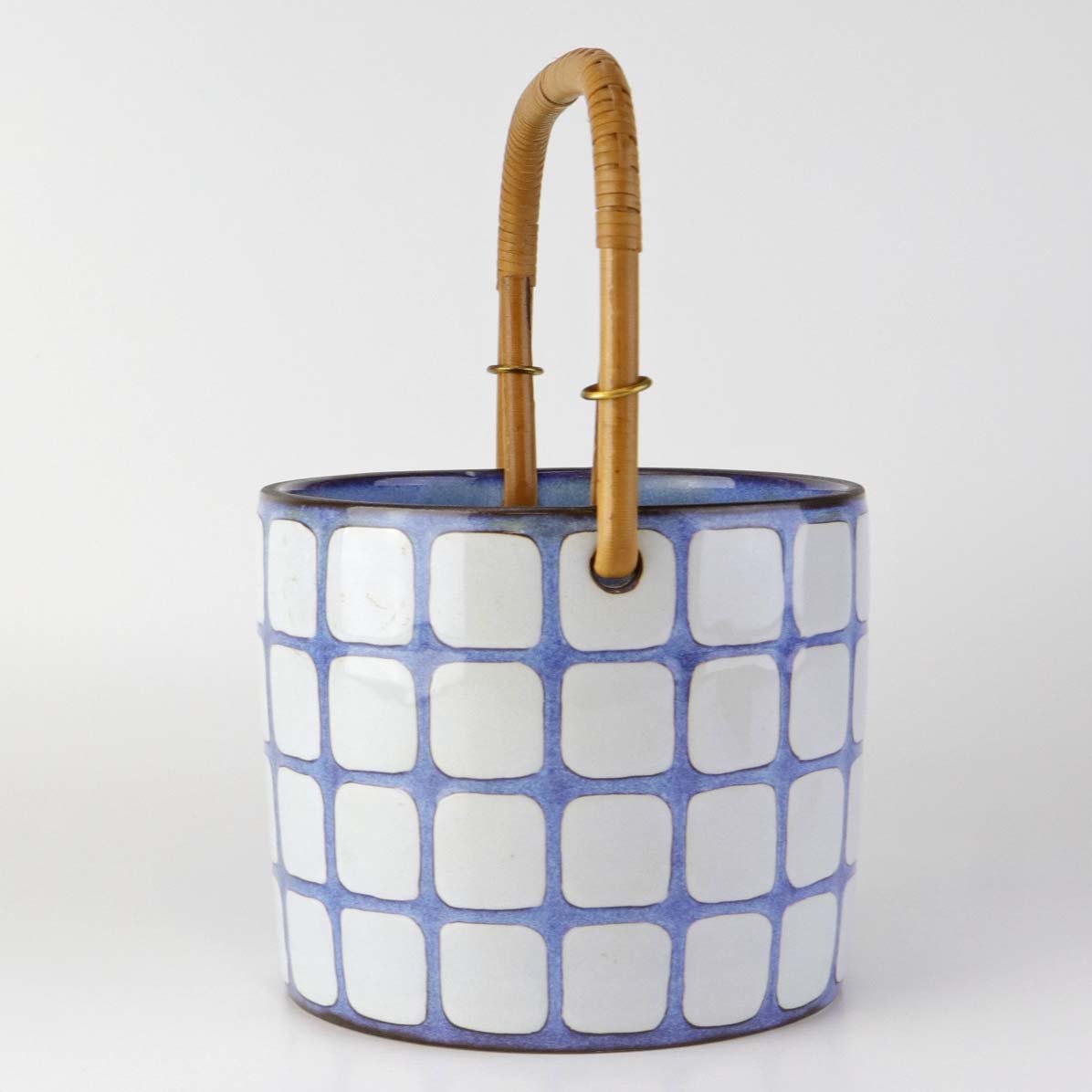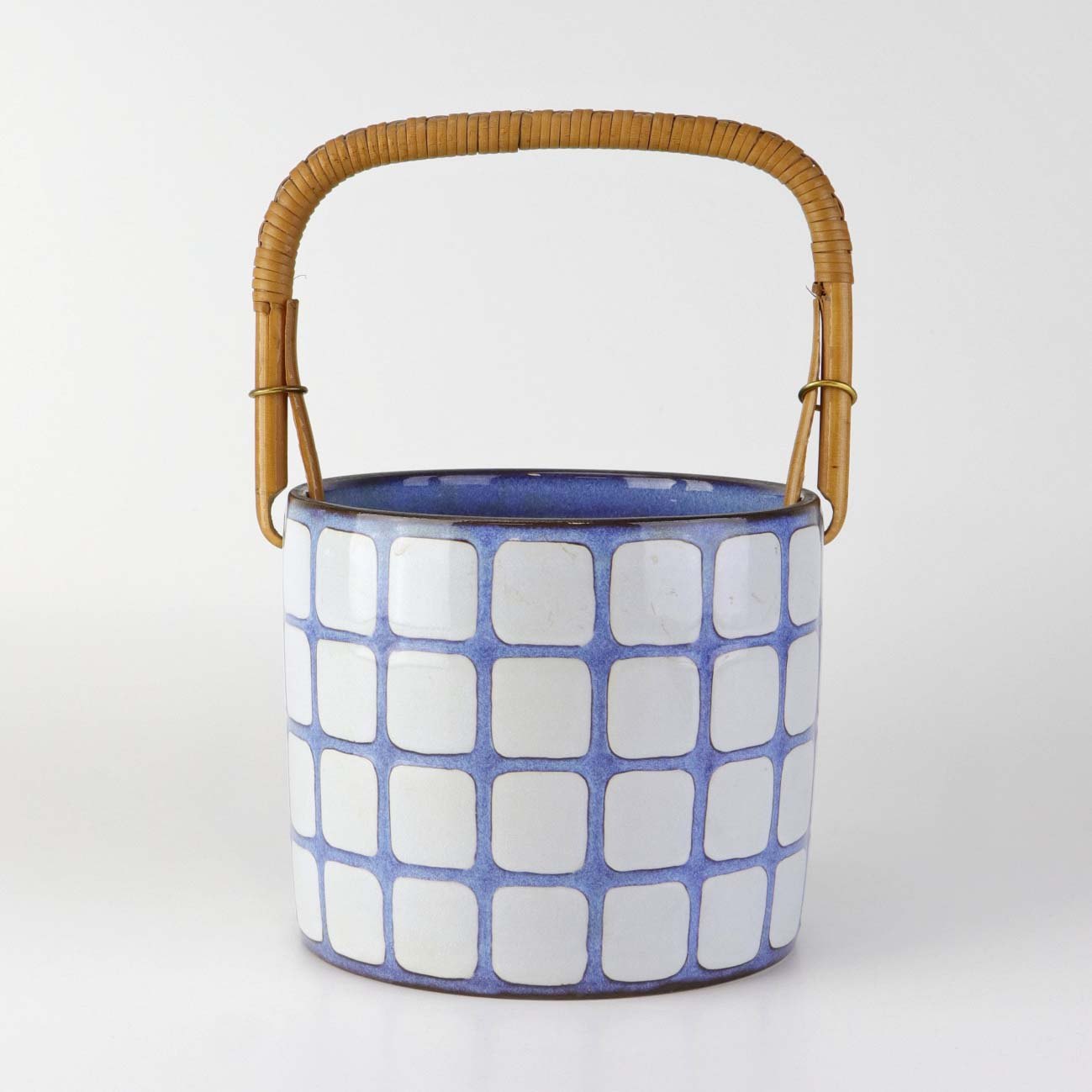 Isspand i lyseblå fajance med hvide tern og tilhørende tang i metal. Spandens hank og grebet på tangen er lavet af bambusflet. Nr. 3310