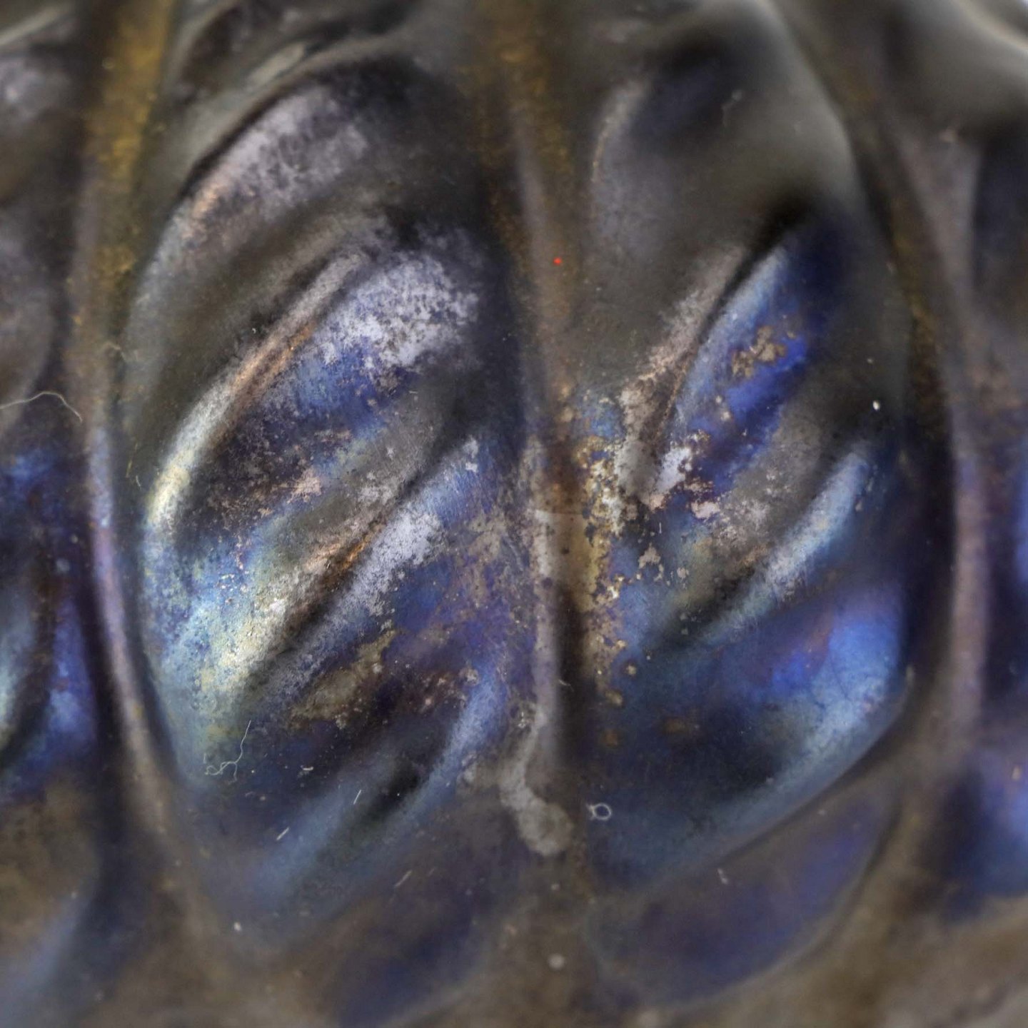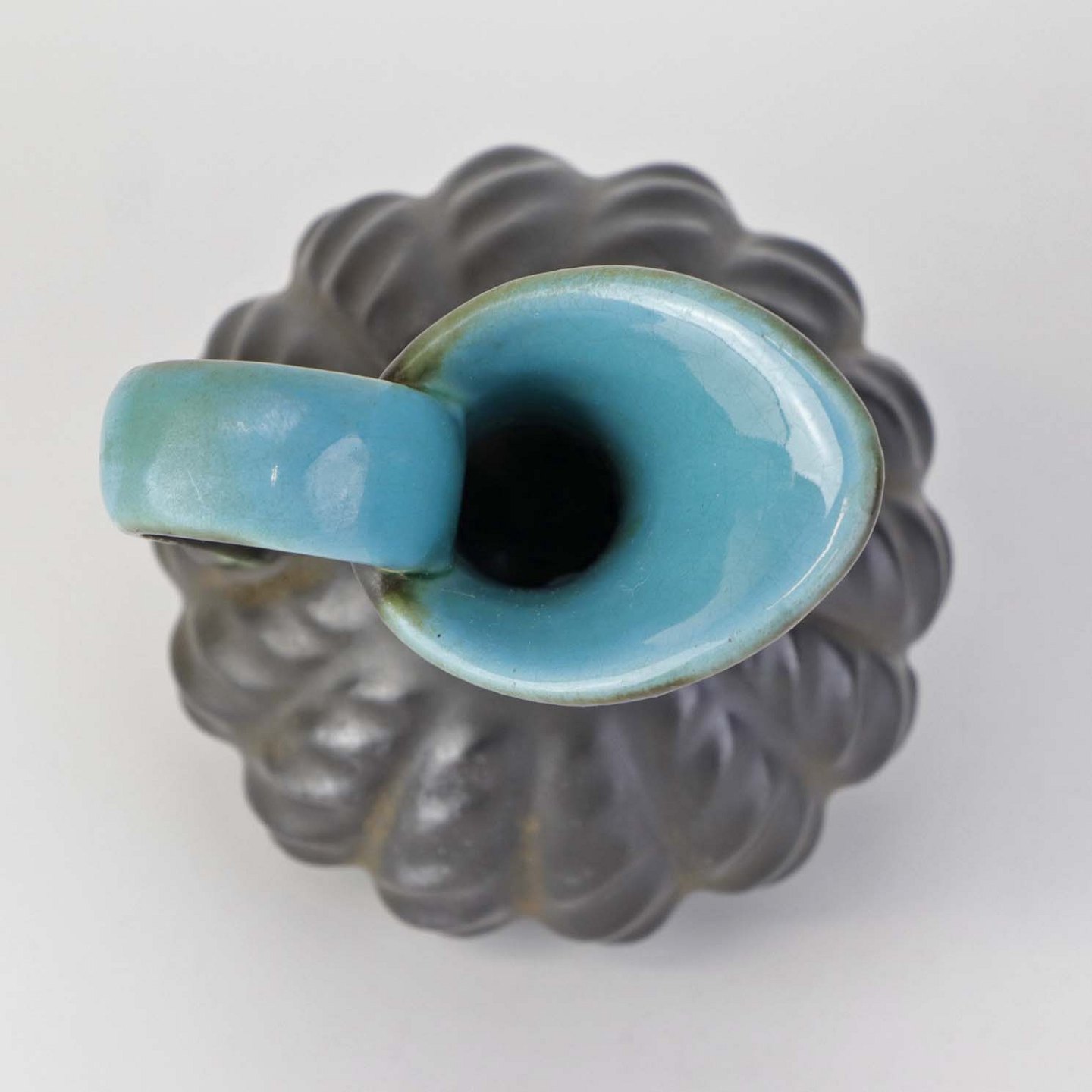 Kande i keramik med indvendig turkis glasering og udvendig mørk og delvist metallisk glasering.