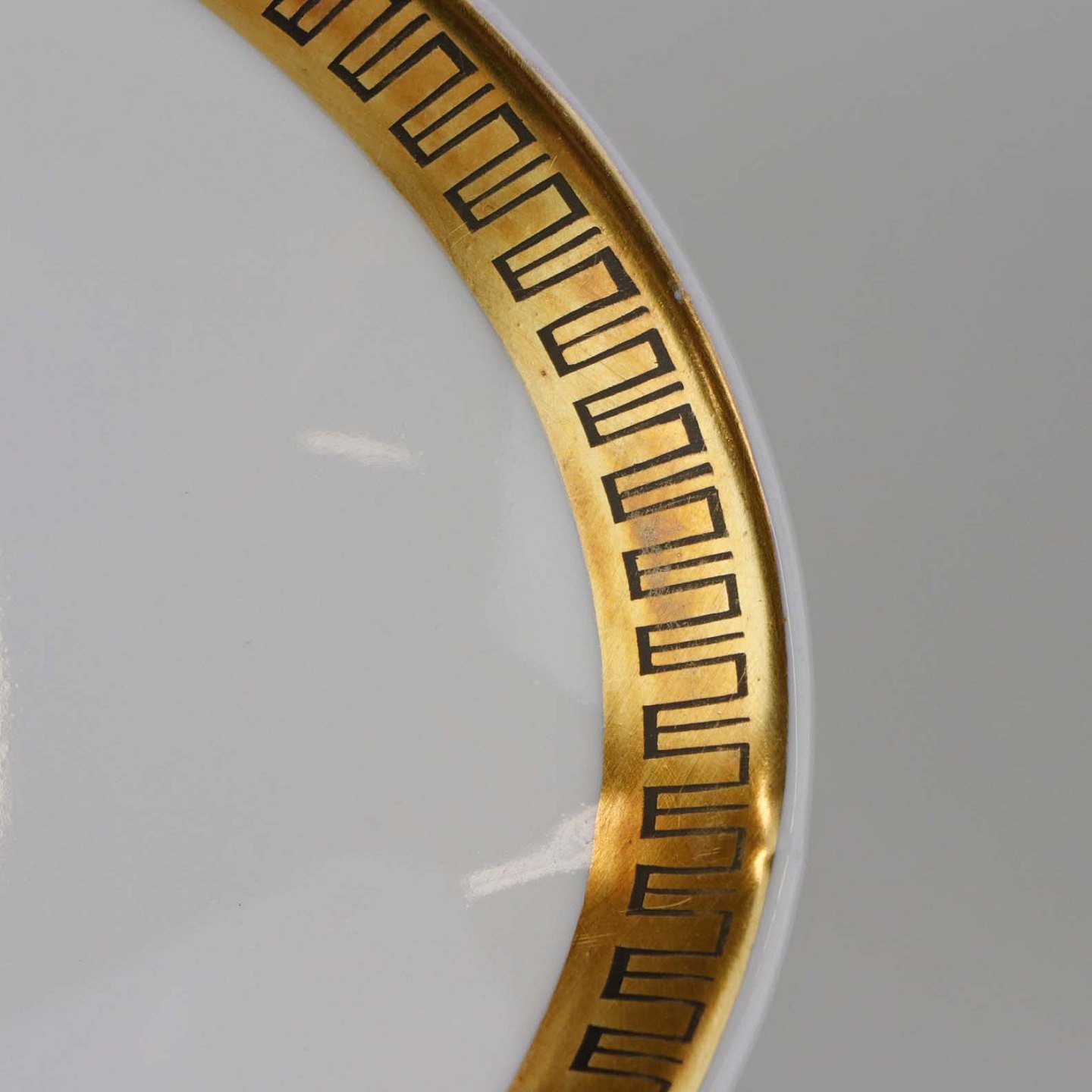 Stel i glat hvidt porcelæn dekoreret med sort streg i guldbort.