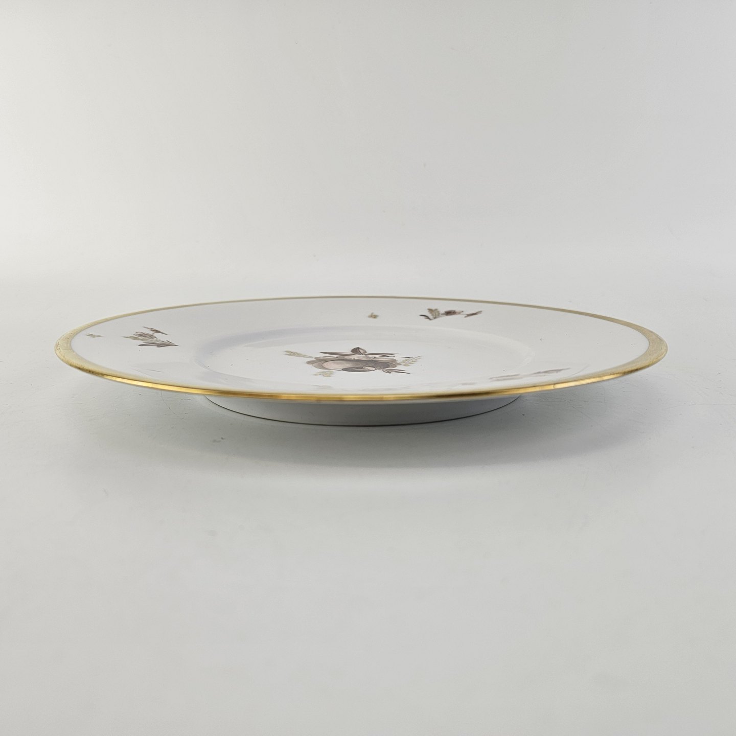 Stel i glat hvidt porcelæn dekoreret med brune roser og guldbort