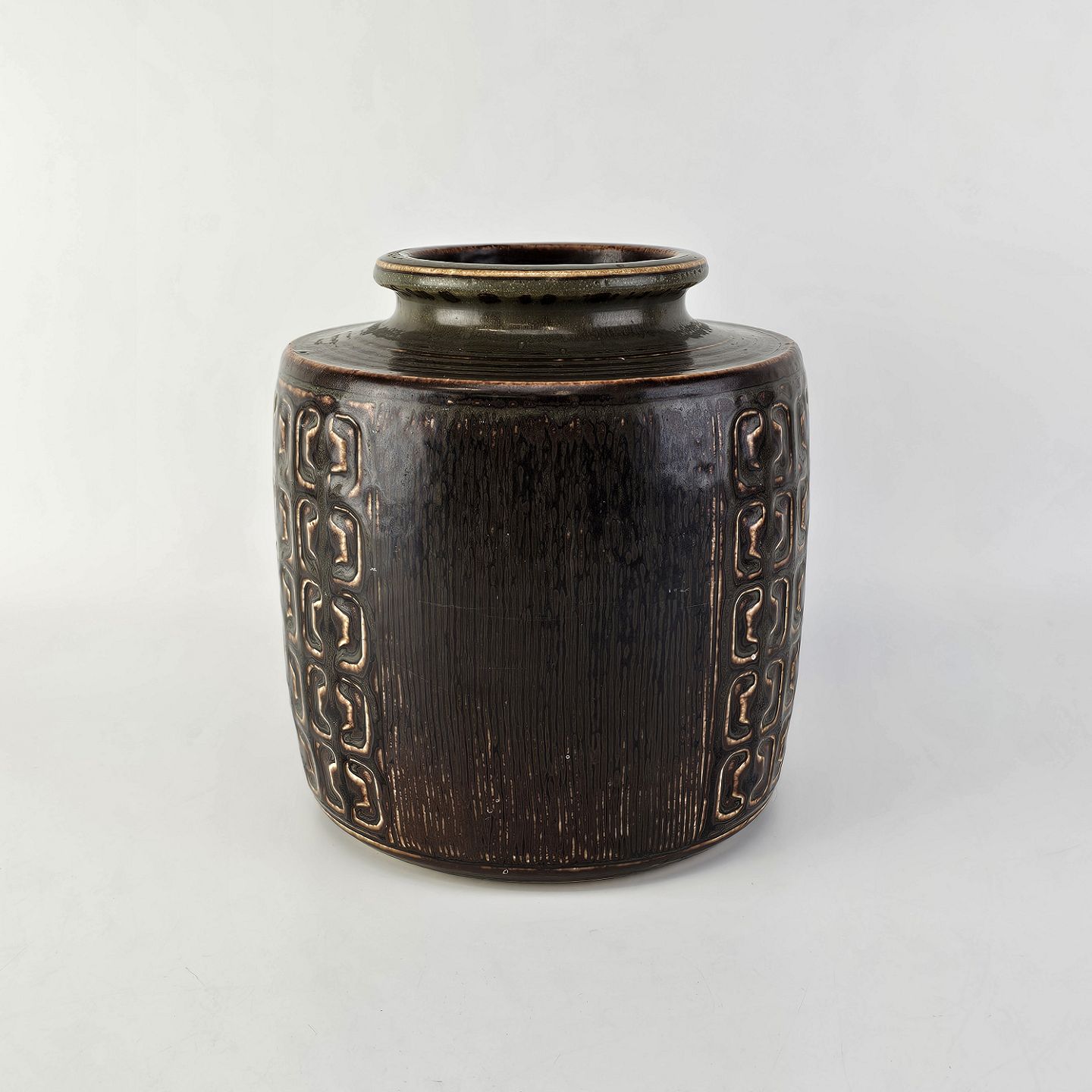 Vase i stentøj med riller og abstrakt mønster i brun glasur