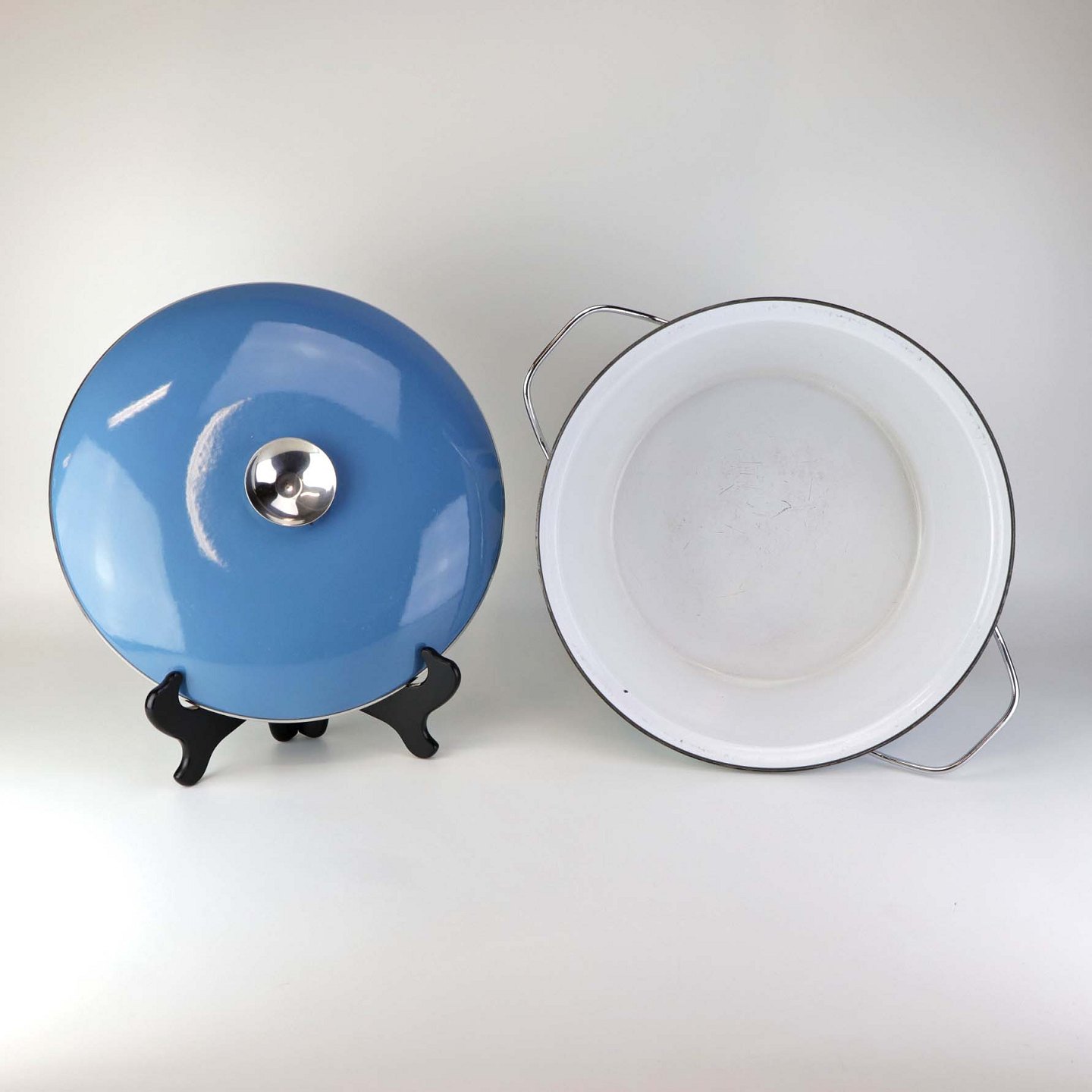 Stor emalje gryde med låg og med blå Lotus motiv. Gryden er fra 1960'erne.