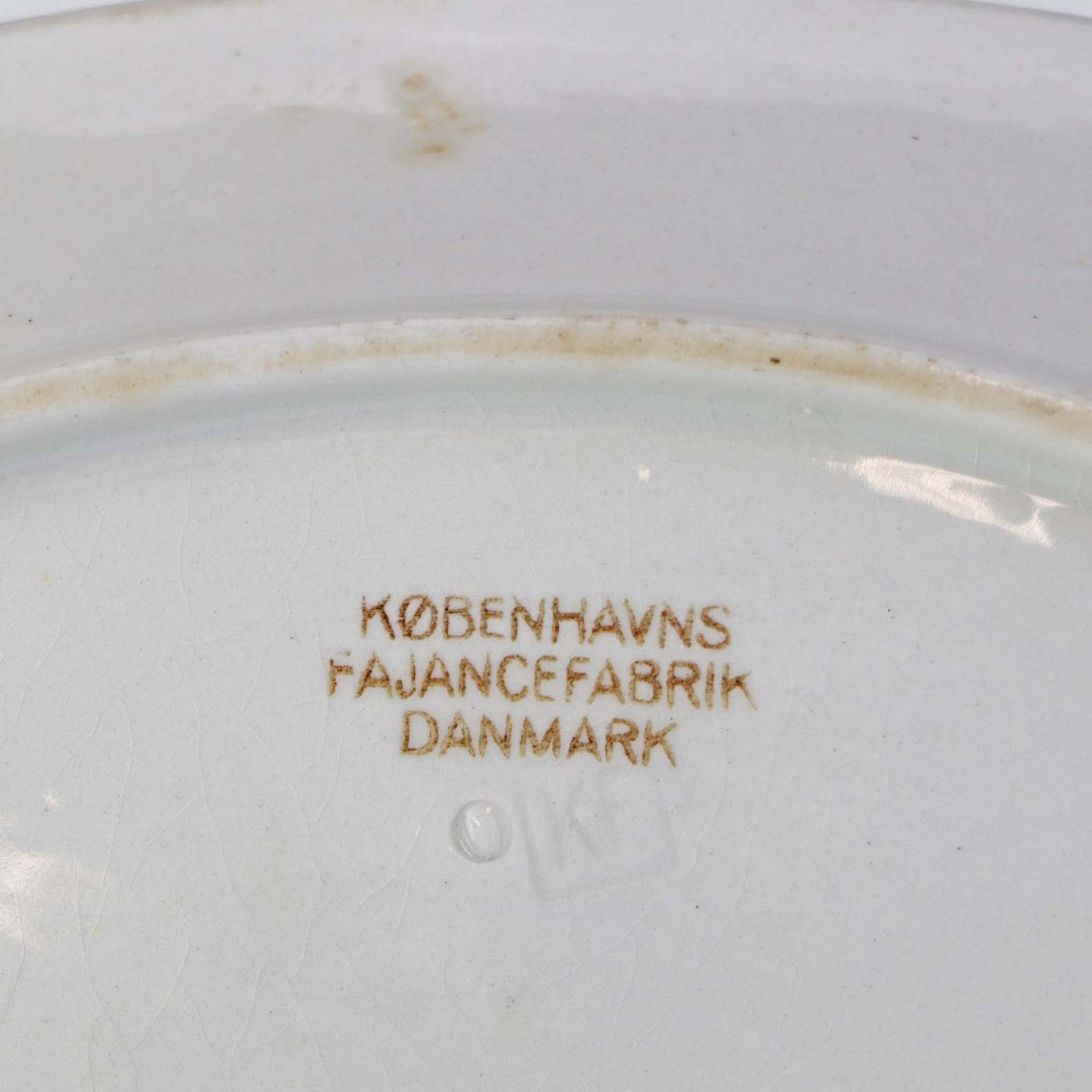 Fremstår med krakkeleringer i glasuren samt mindre område med mørkning under glasuren på fadets underside.
