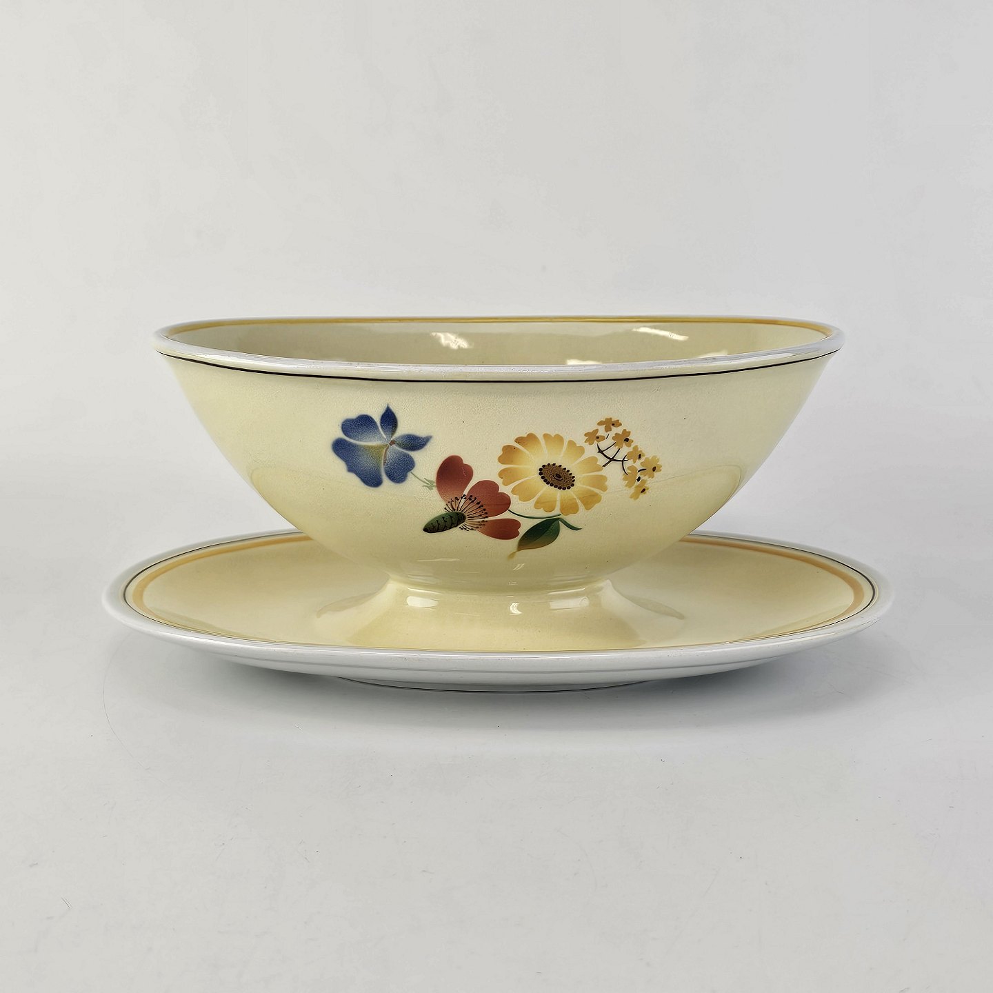 Stel i glat gul fajance med dekoration af farverige og forskelligartede blomster