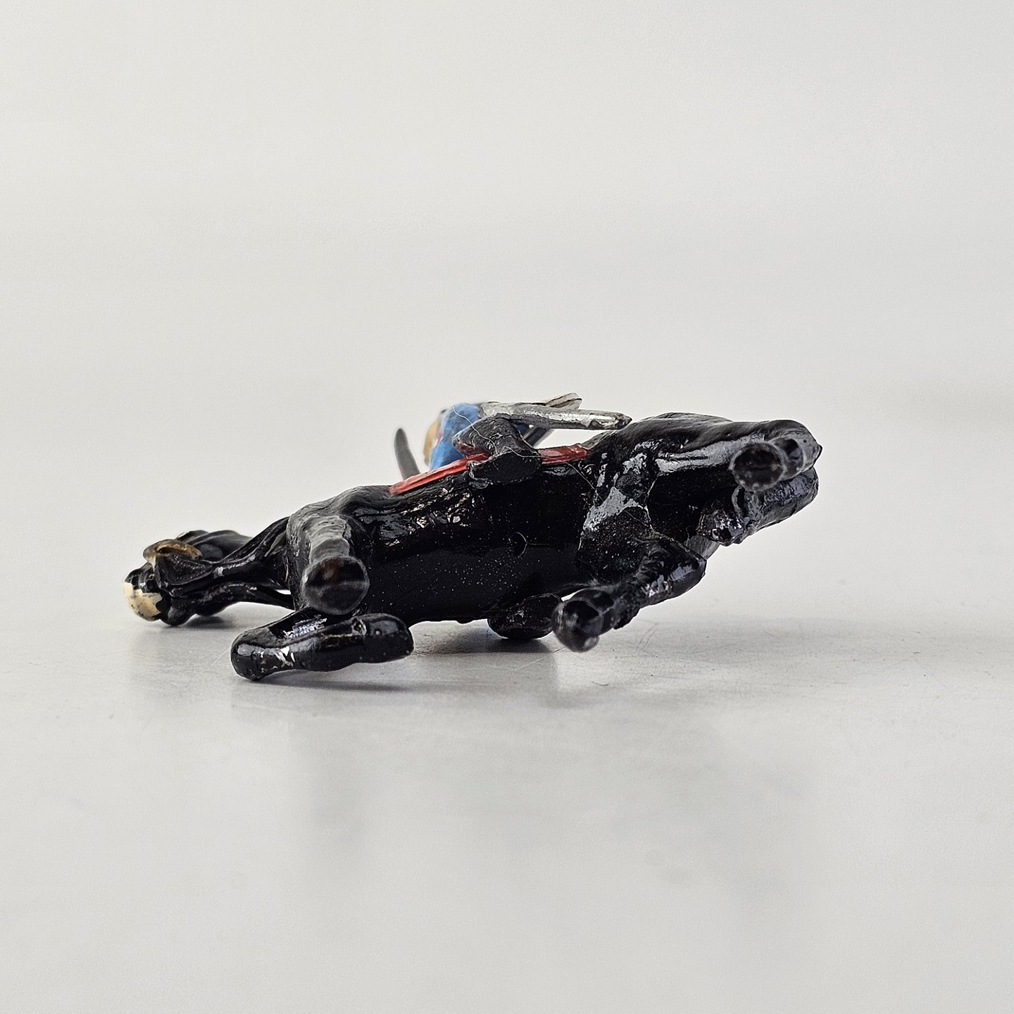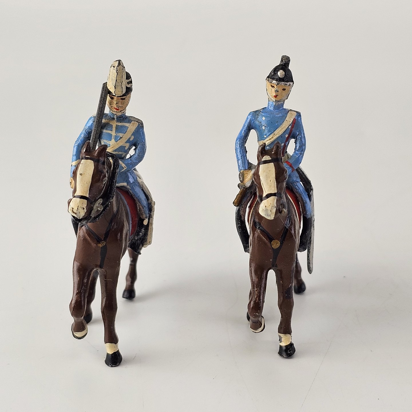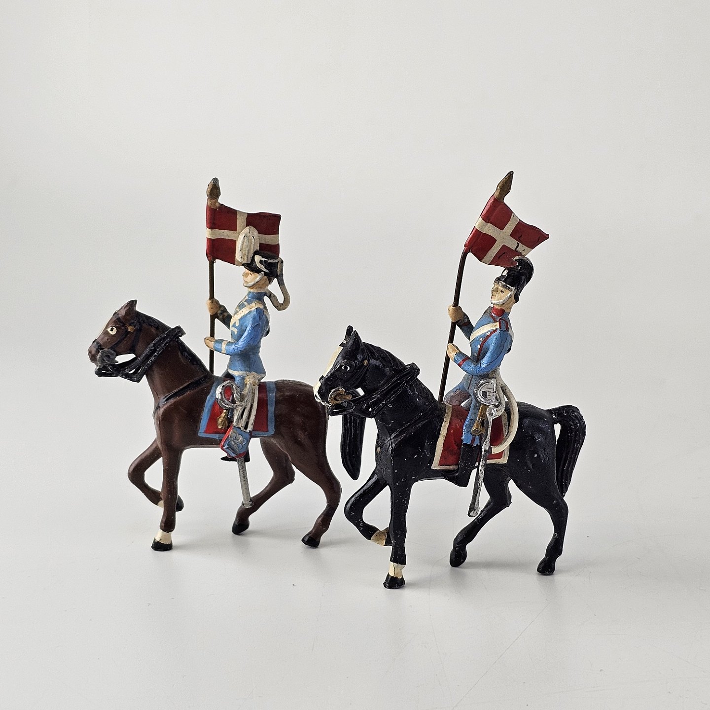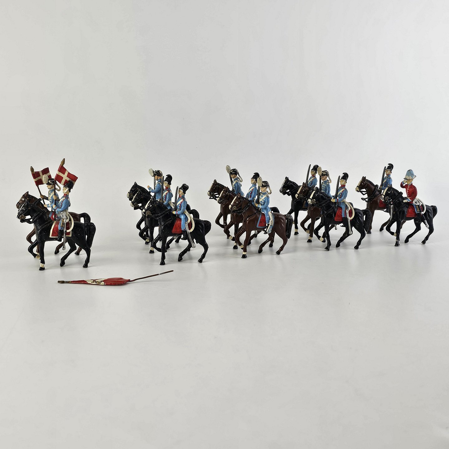 13 figurer af dragoner på heste i tin. Seks brune heste og syv sorte heste, to dragoner rider med flag og ni med sabler, og en løs fane