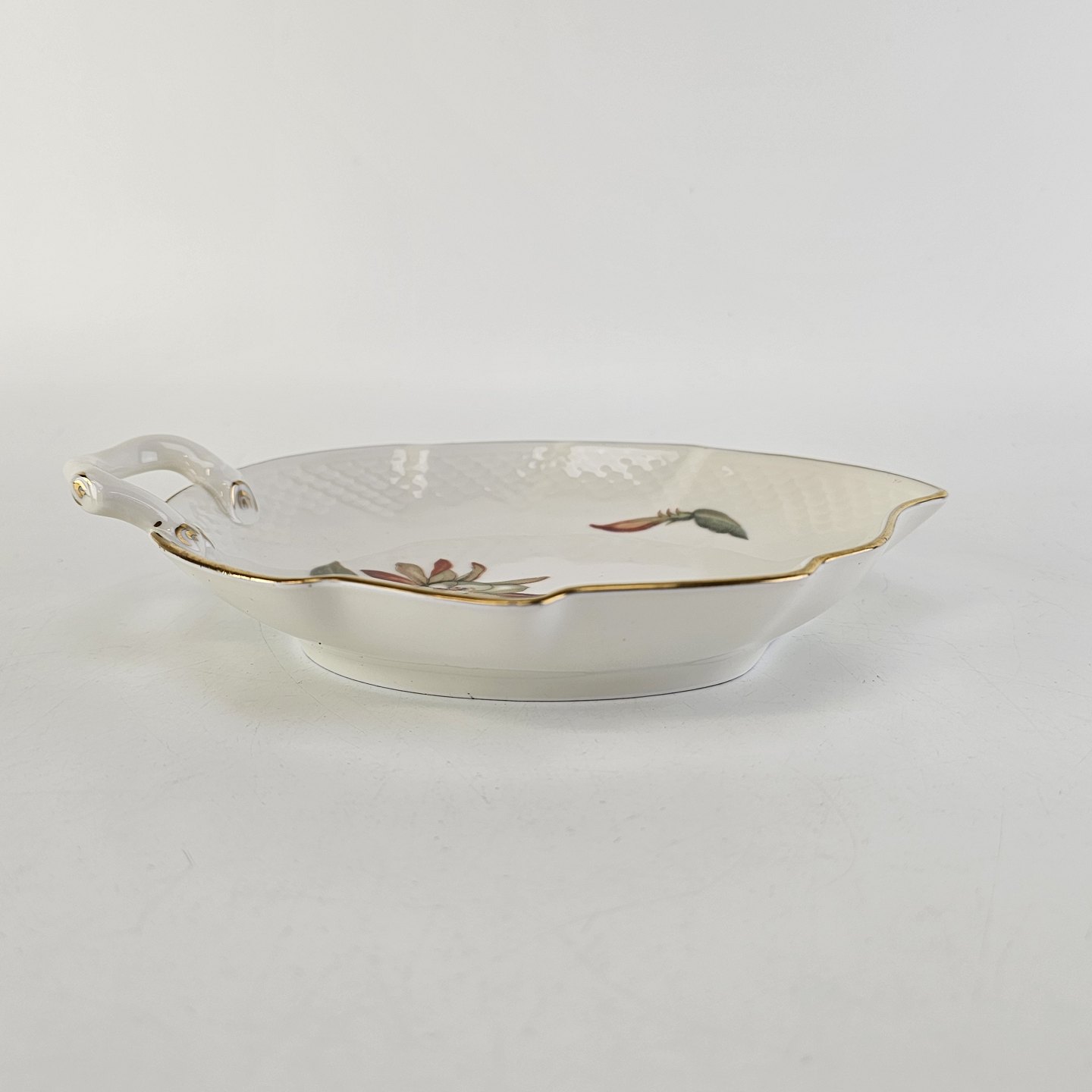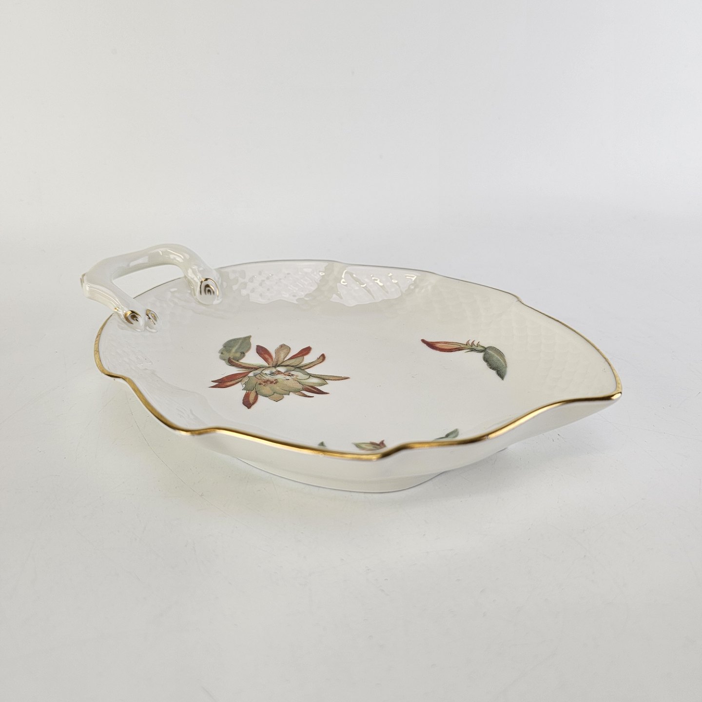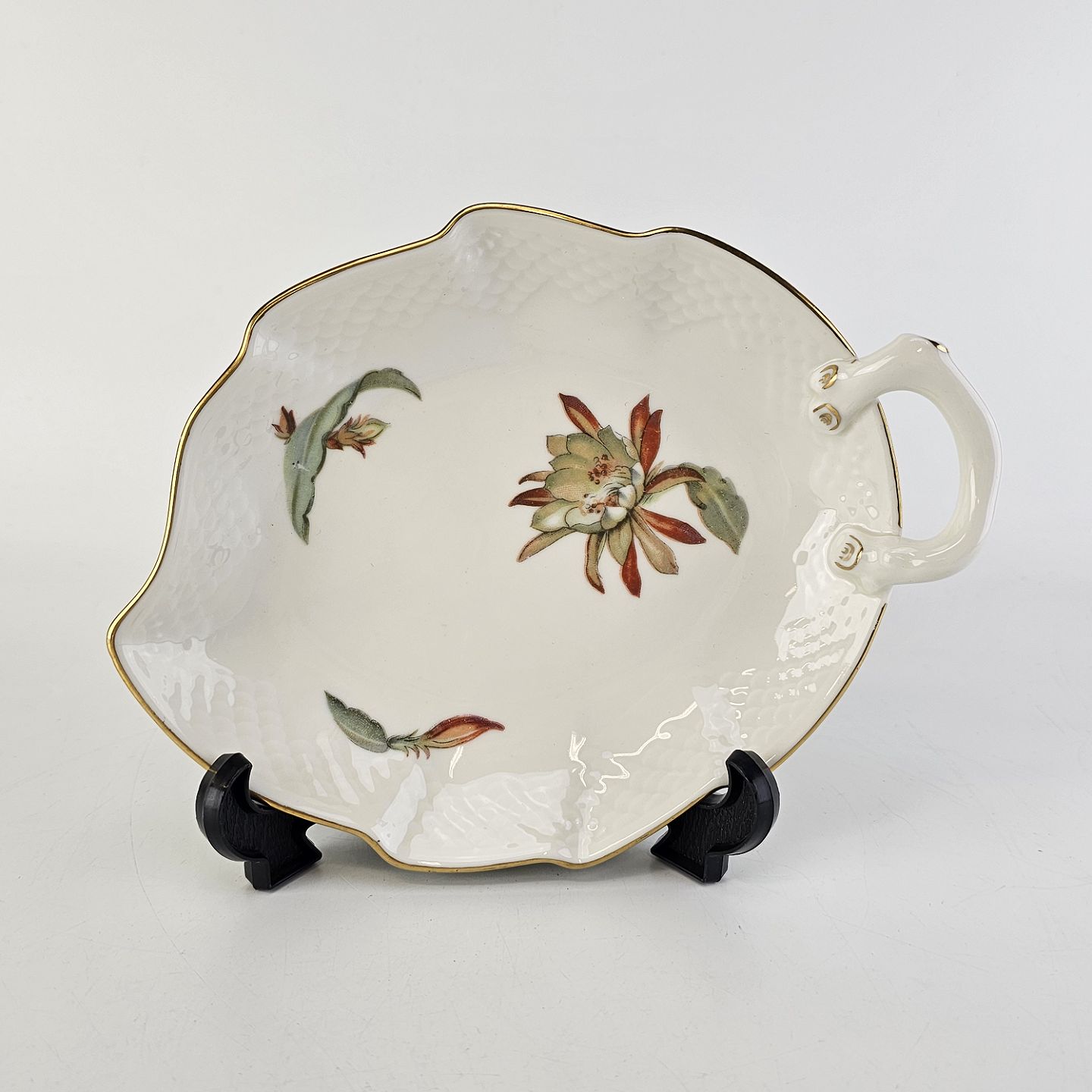 Kaktus er cremefarvet porcelæn i skælform, dekoreret med kaktusblomster og guldkant