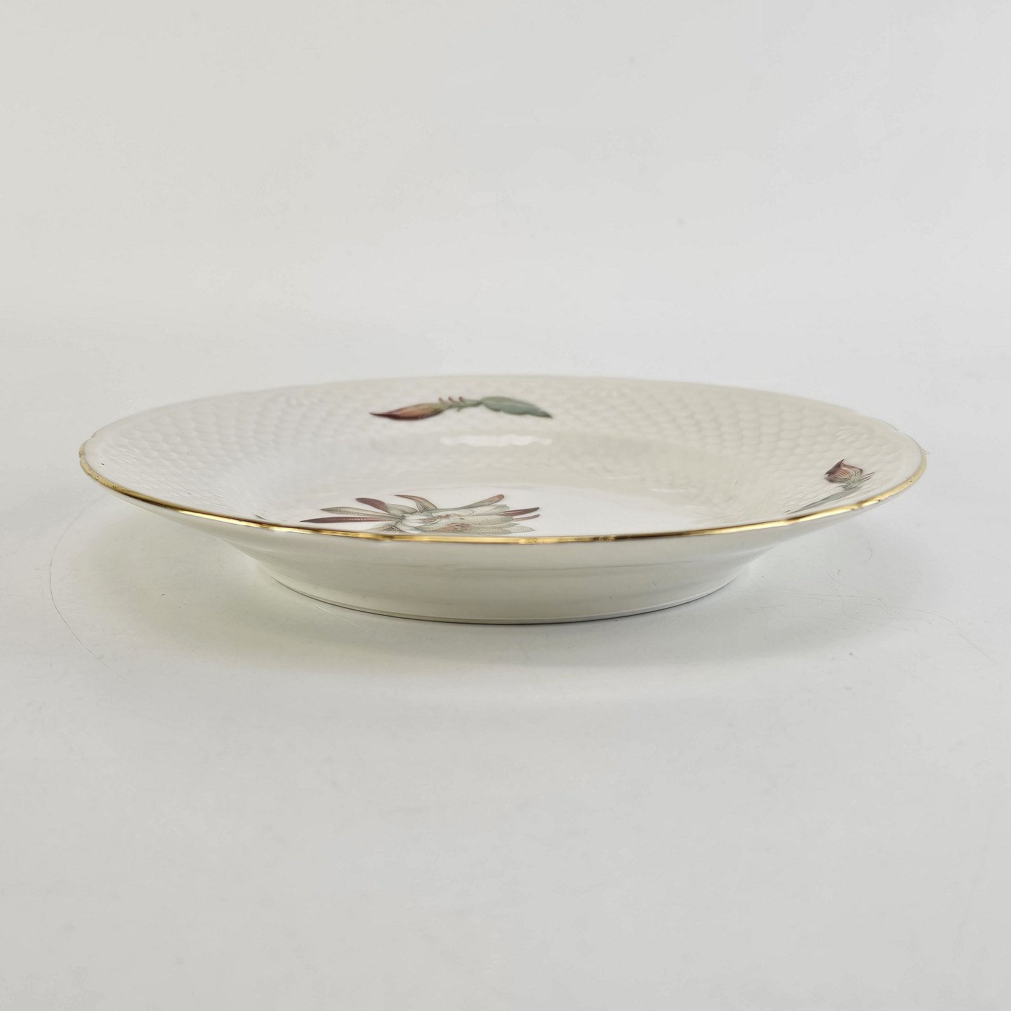Kaktus er cremefarvet porcelæn i skælform, dekoreret med kaktusblomster og guldkant