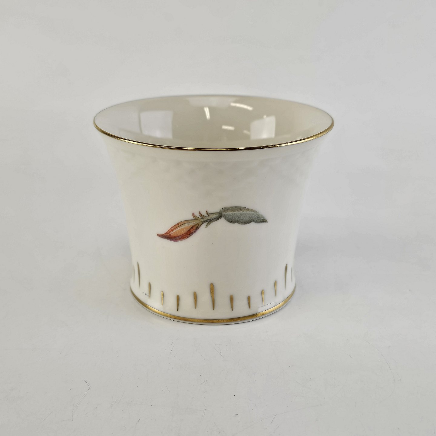 Kaktus er cremefarvet porcelæn i skælform, dekoreret med kaktusblomster og guldkant