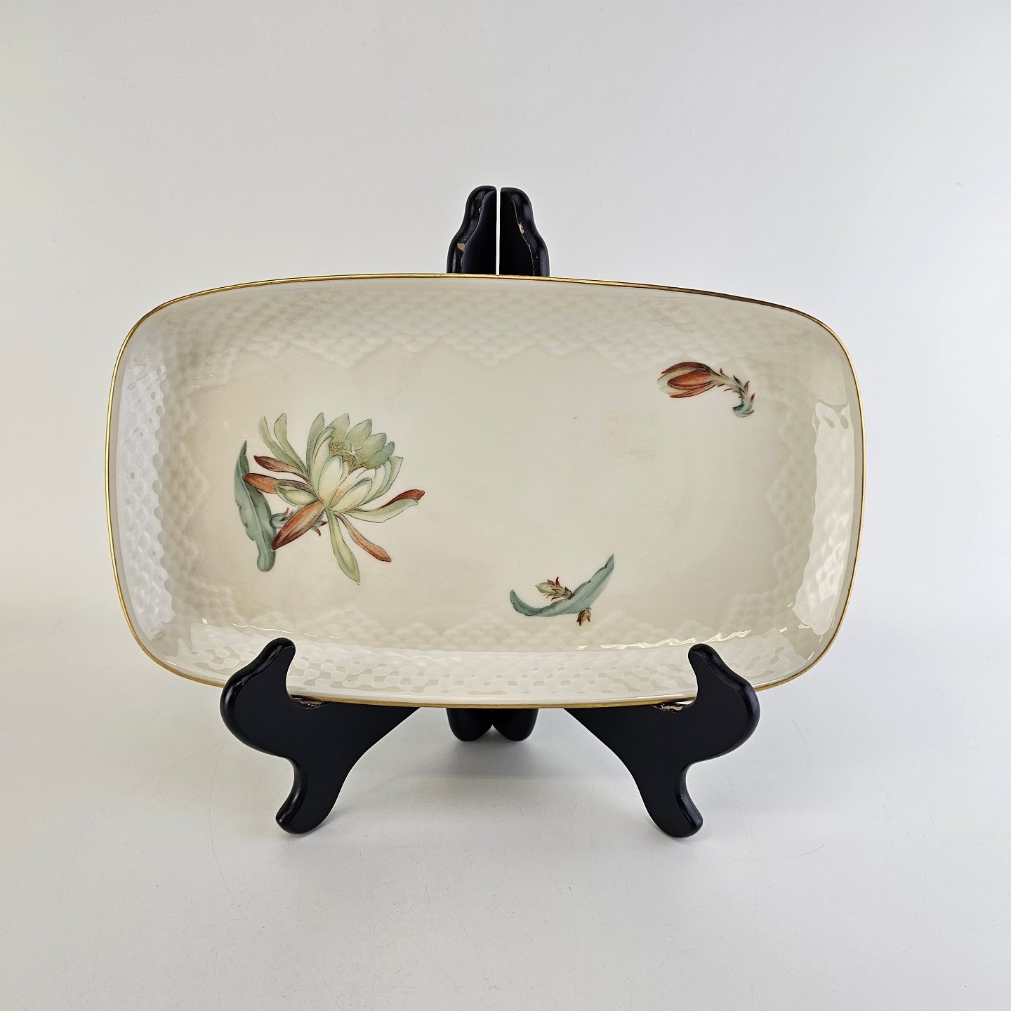 Kaktus er cremefarvet porcelæn i skælform, dekoreret med kaktusblomster og guldkant