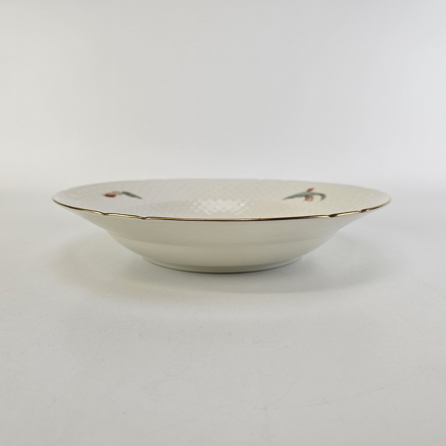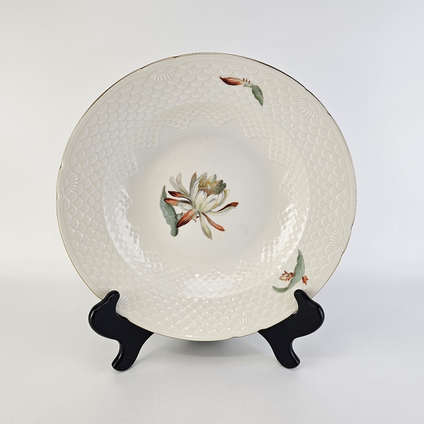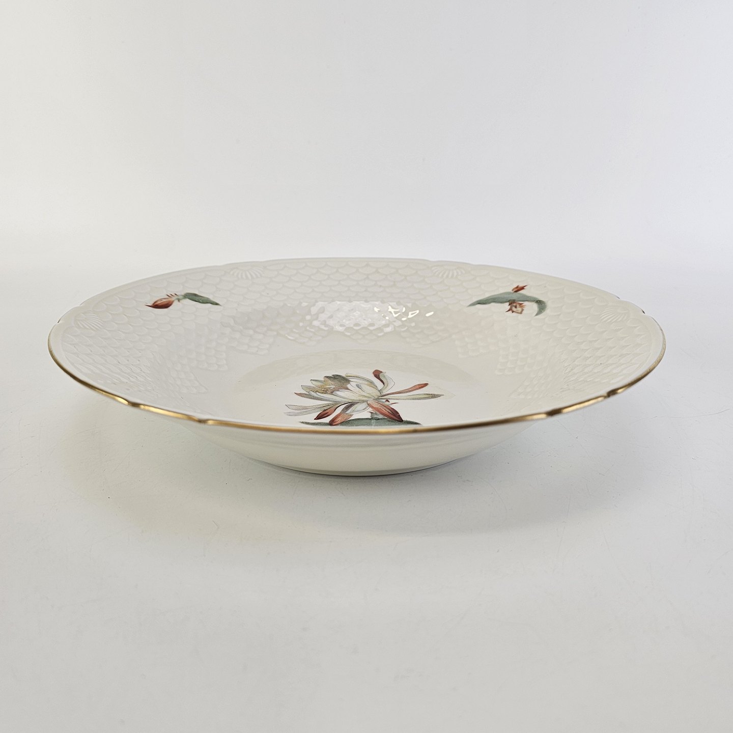 Kaktus er cremefarvet porcelæn i skælform, dekoreret med kaktusblomster og guldkant