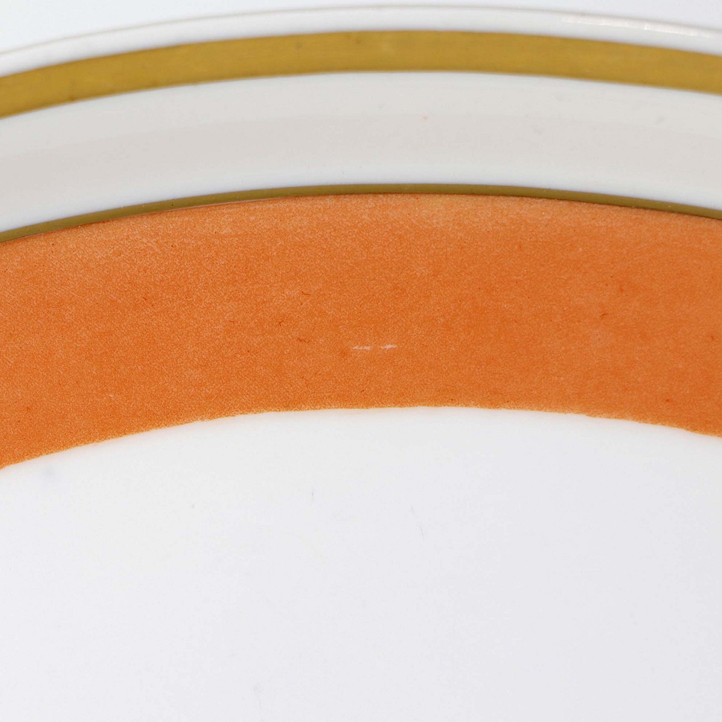 Service i glat hvidt porcelæn med orangerød dekoration over glasuren og guldkant