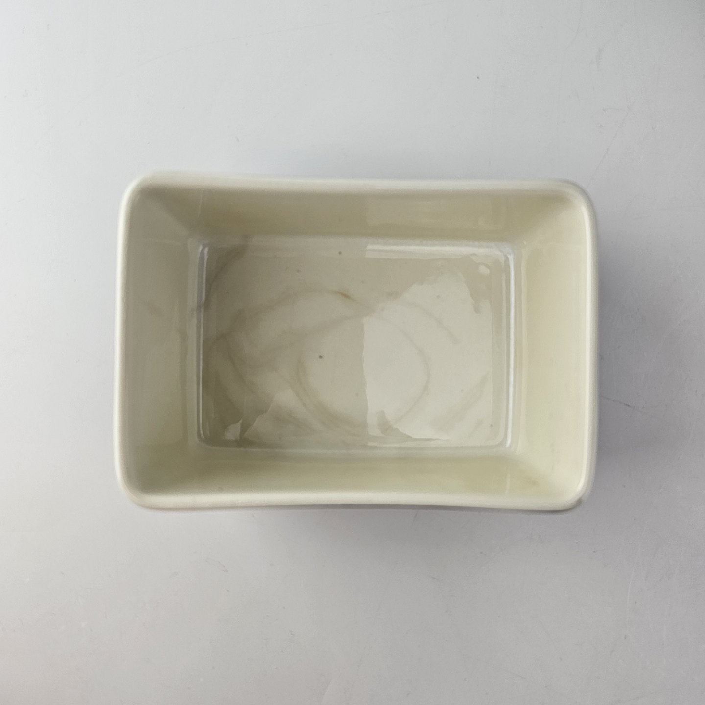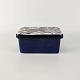 Smørboks fra serien Tenera. Boksen er i hvid fajance med blåmalet yderside og låget er dekoreret med motiv af en påfugl