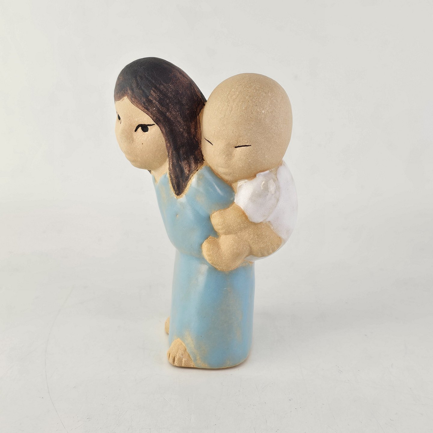 Figur i keramik med motiv af en pige med lys hud og brunt hår, som har et barn på ryggen.