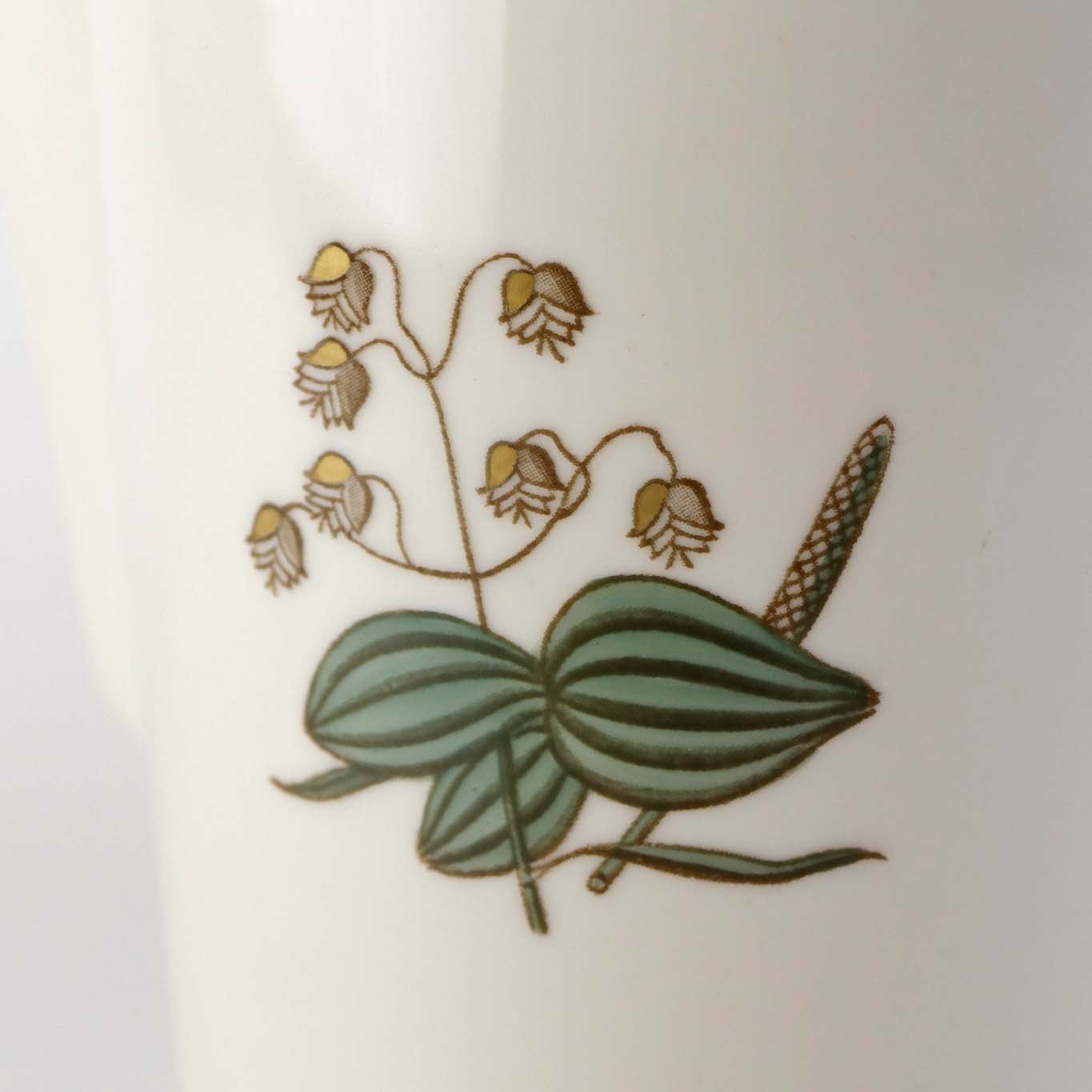 Stel i glat råhvidt porcelæn dekoreret med lysegrøn stribe og guldkant samt motiv af hjertegræs.