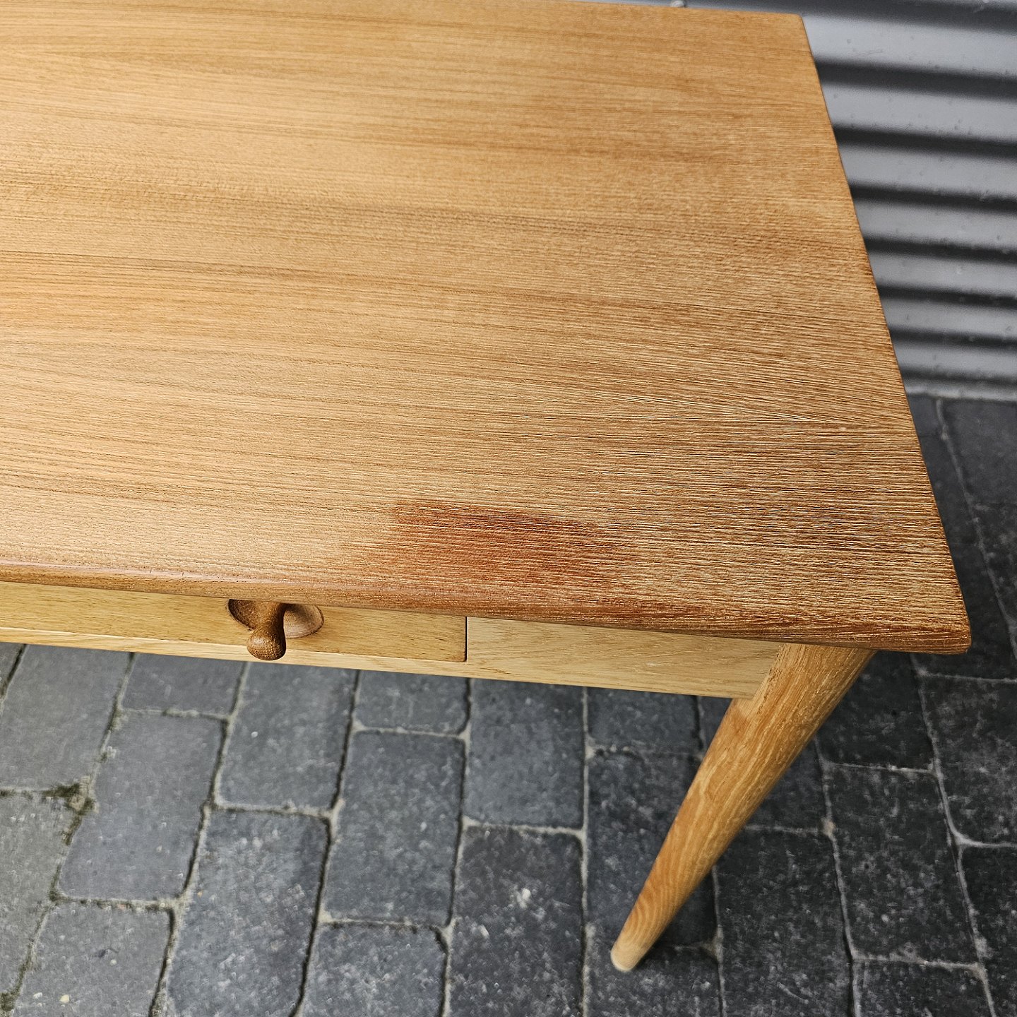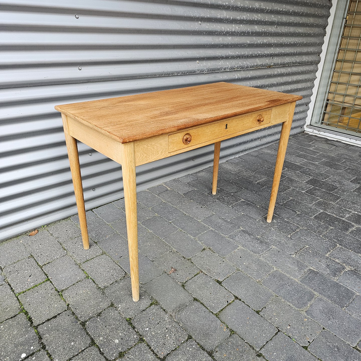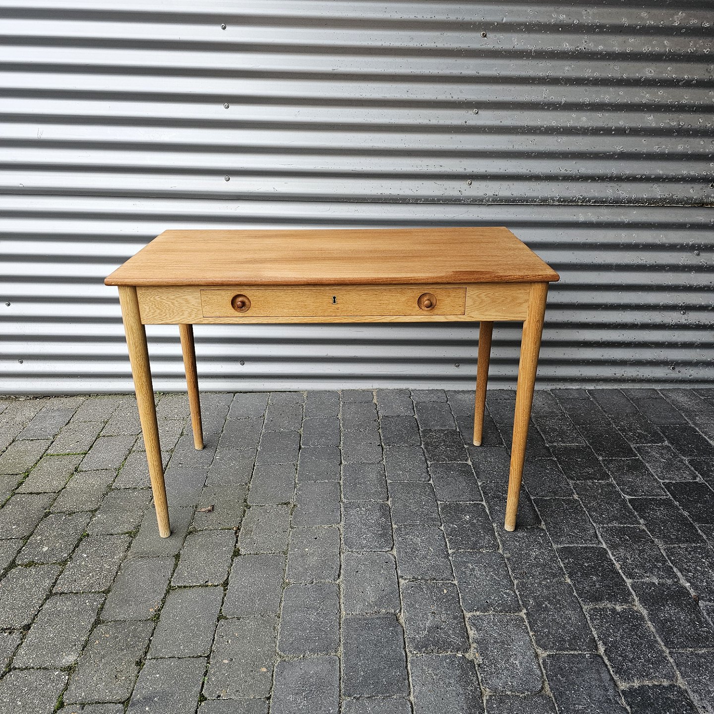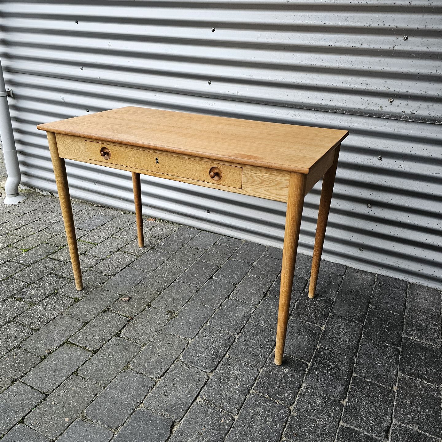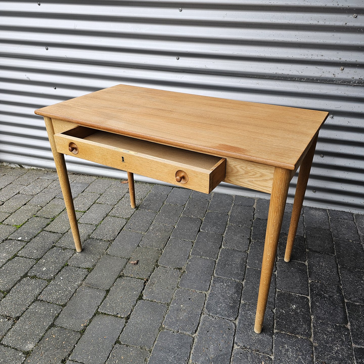 Skrivebord i egetræ med stor skuffe og lås, også kaldet dameskrivebord