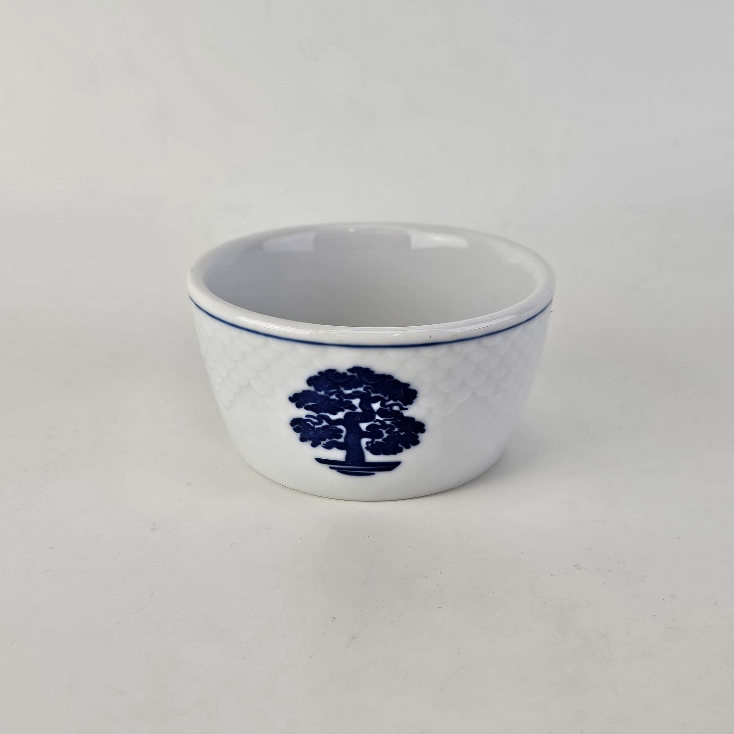 Hotelporcelæn Egetræ er hvidt og dekoreret med en blå streg og et blåt egetræ i midten