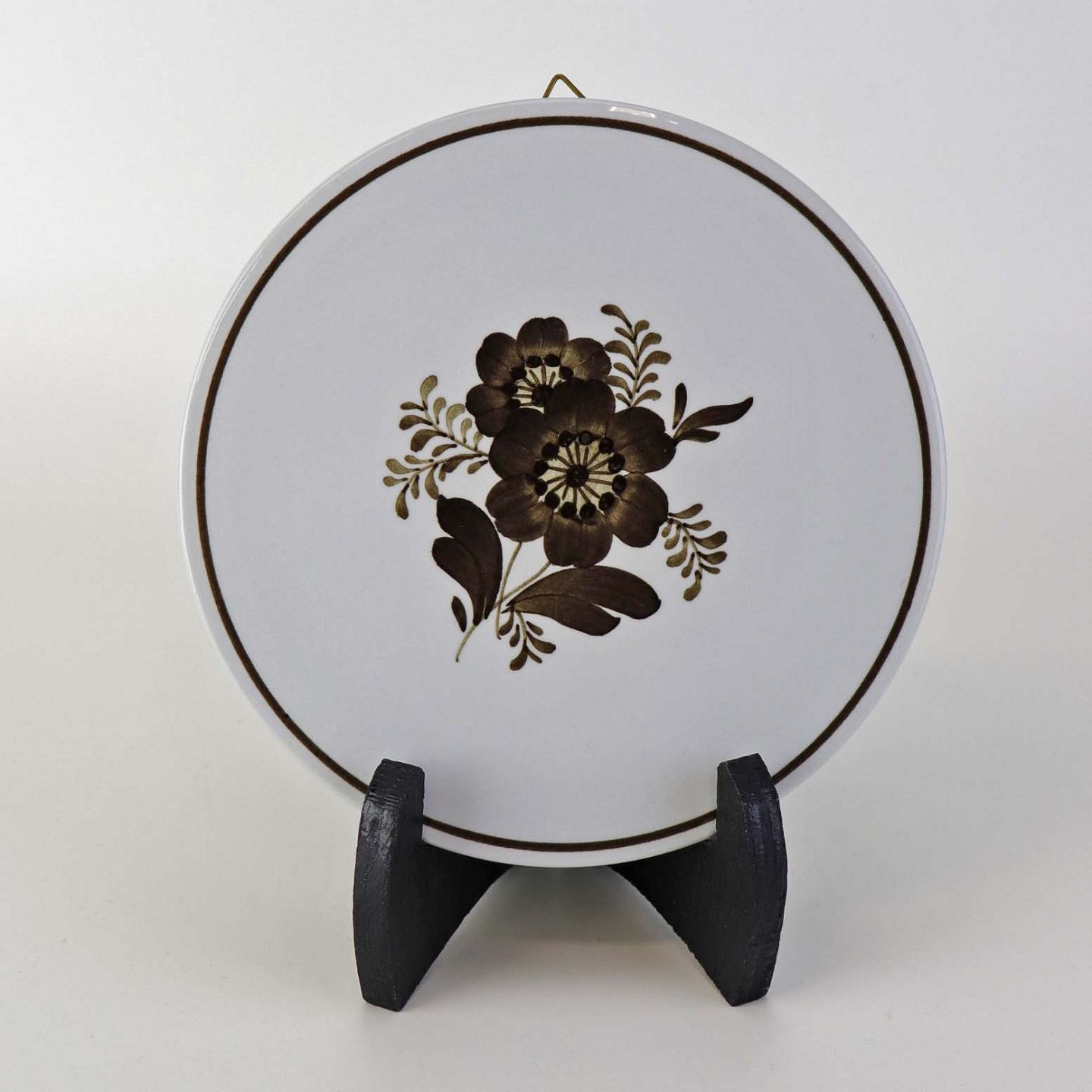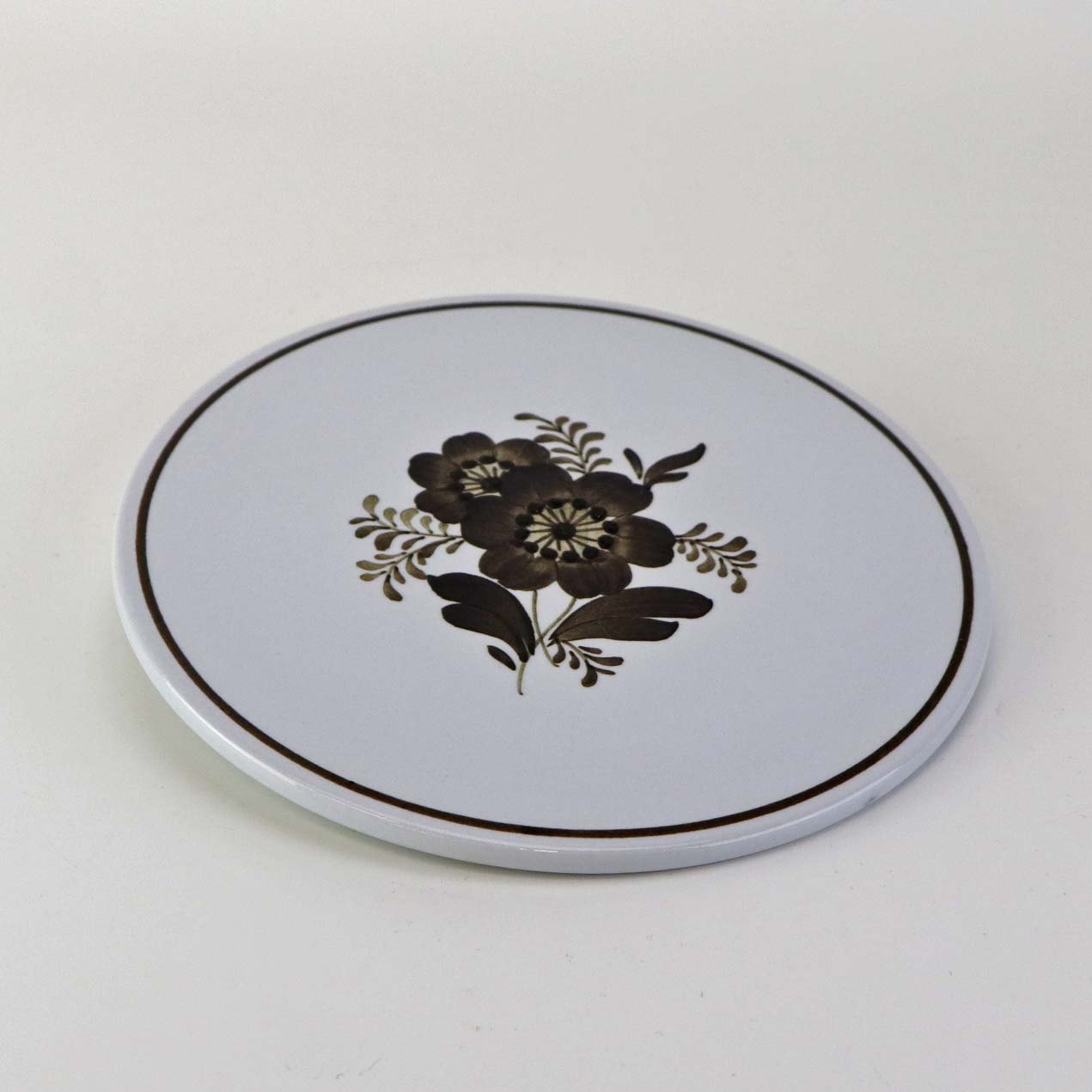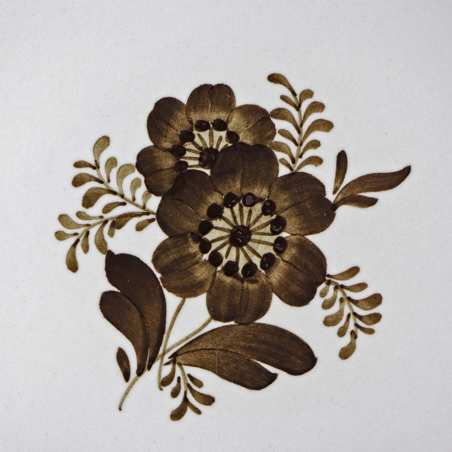 Fajancestellet med flettet kant og dekoration af brune blomster på lys baggrund med brun kant.