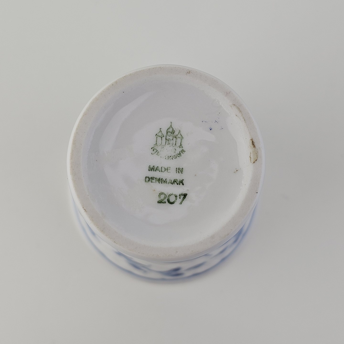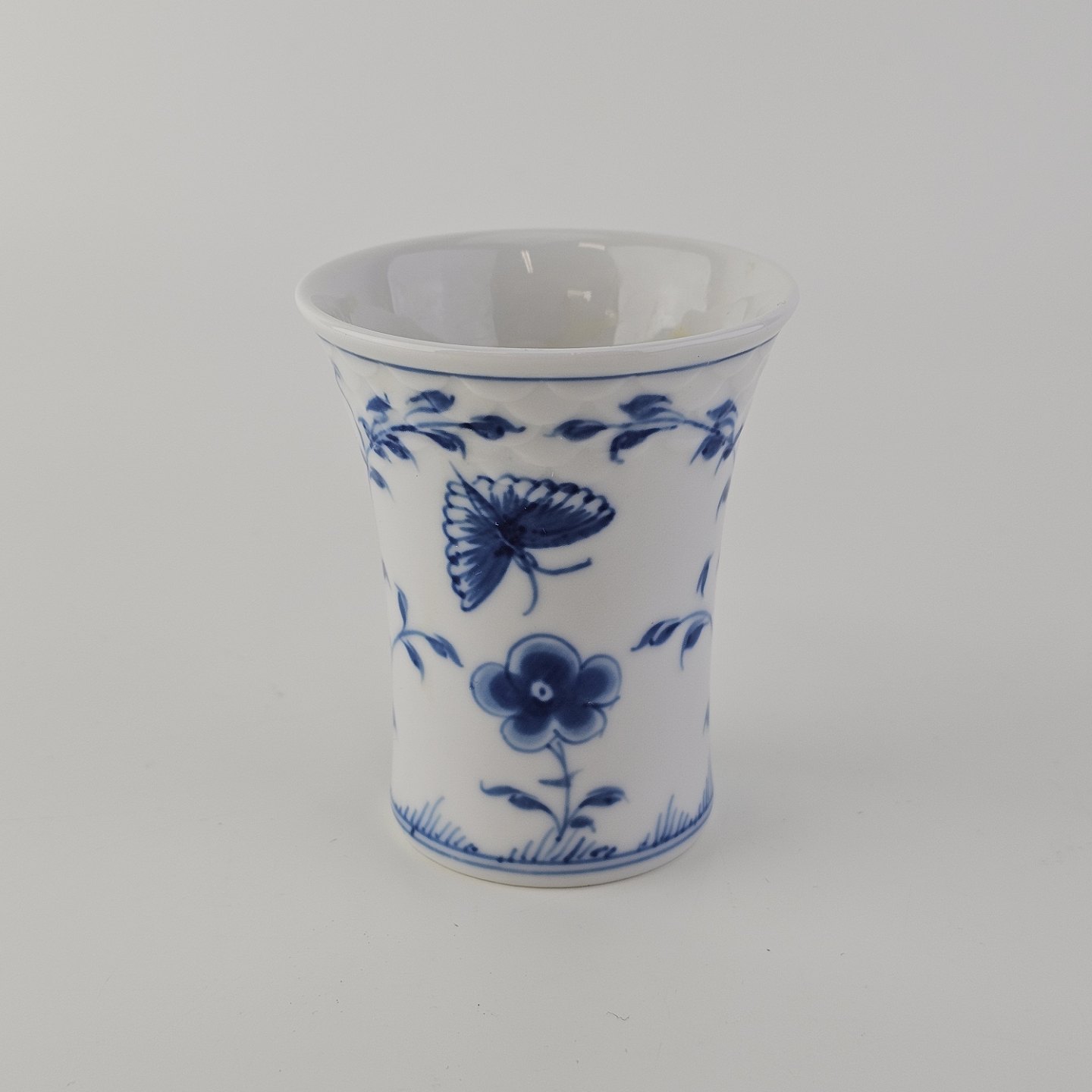 Service i hvidt skælformet porcelæn med blå motiver af blomster og sommerfugle