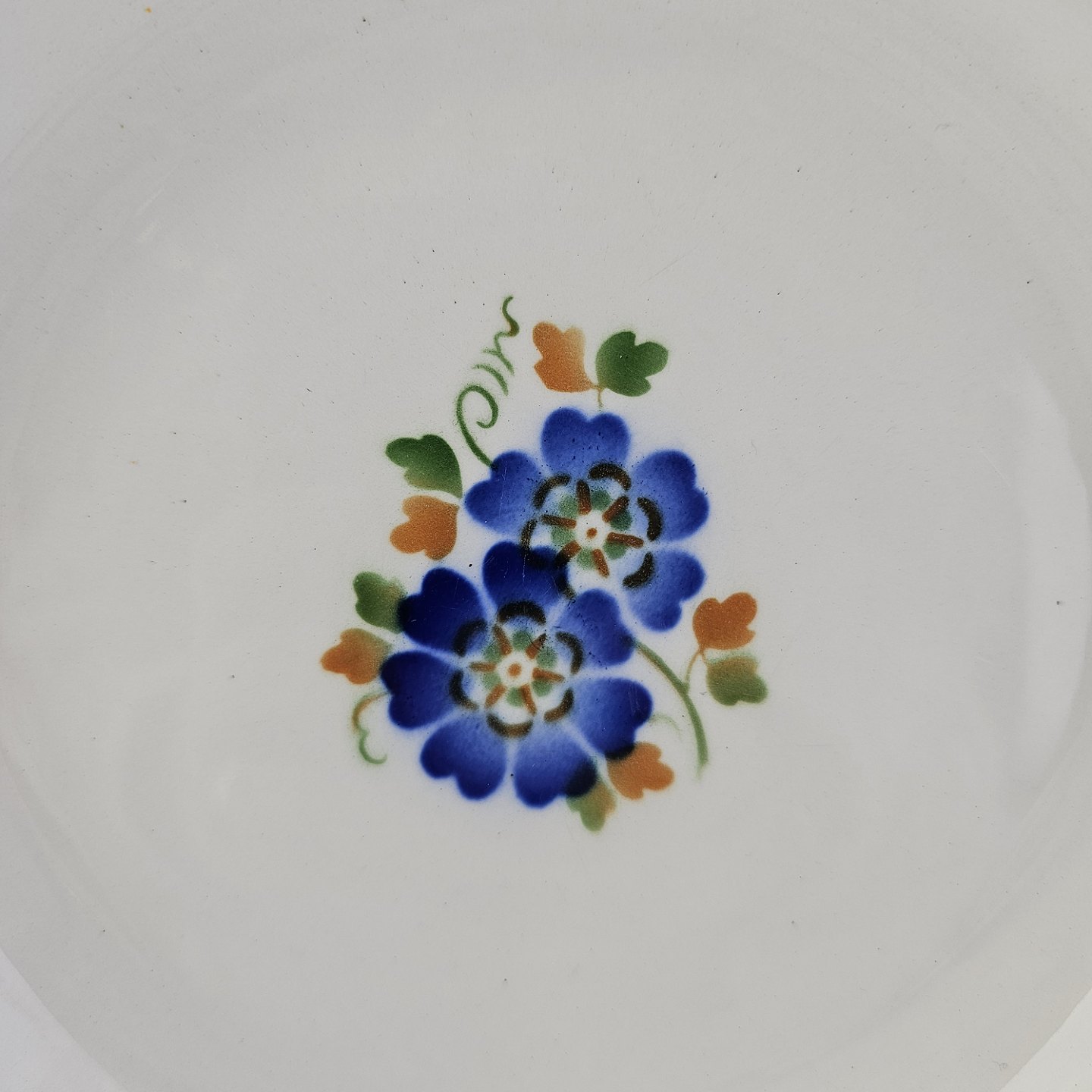 Dyb tallerken i fajance fra stellet Geranium II fremstillet i perioden 1927-1940.