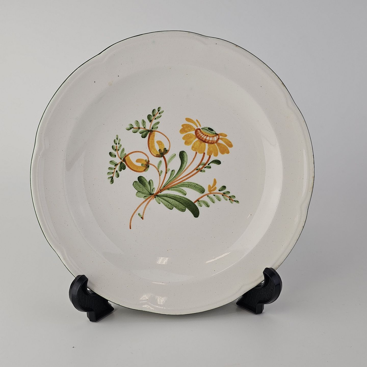Hvidt fajancestel i stelform Feston/Alma med motiv af gule blomster og grønne blade.
