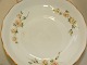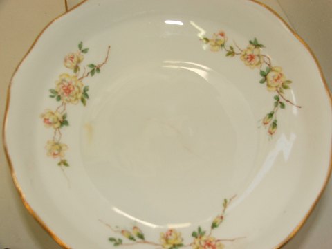 Kongelig spise stel gul/rosa rosenraker Grundstellet "Det hamrede stel" tegnet af Professor Arnold Krog i 1887 og stellet er mærket med bølger anvendt til 1890. Det må i sin tid have været et fornemt stel. Der kan på billedet anes en hårrevne midt i skålen, som den formentlig er født med.