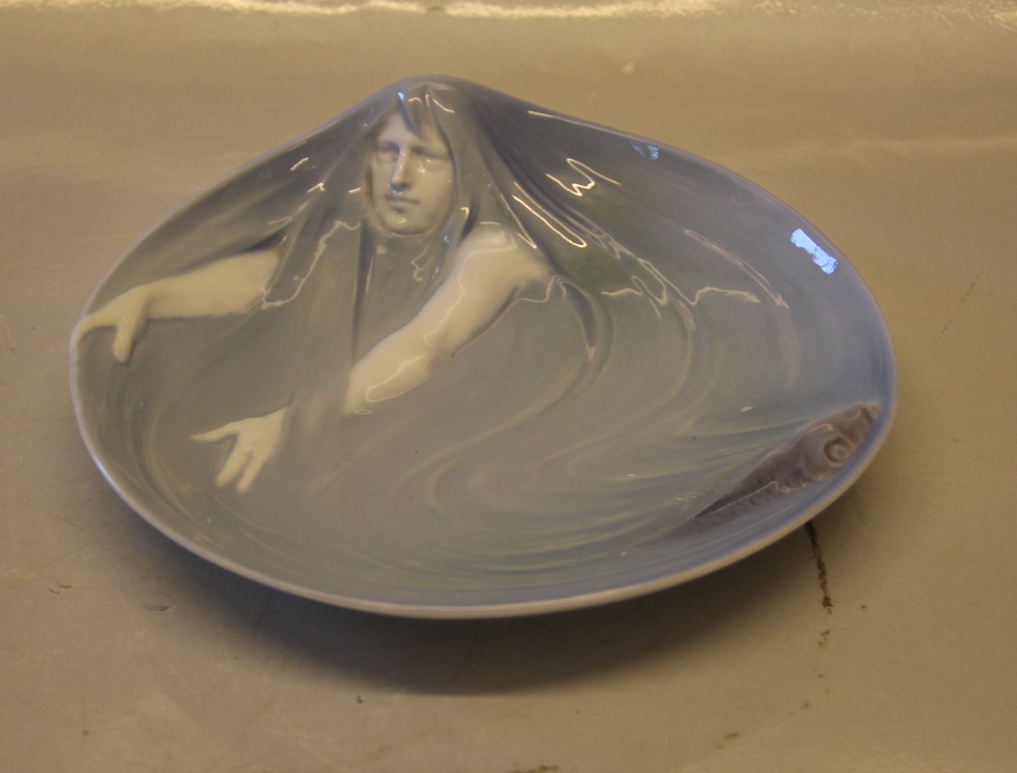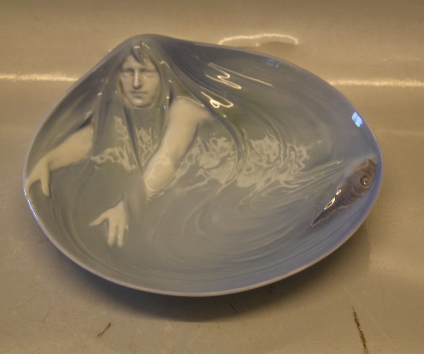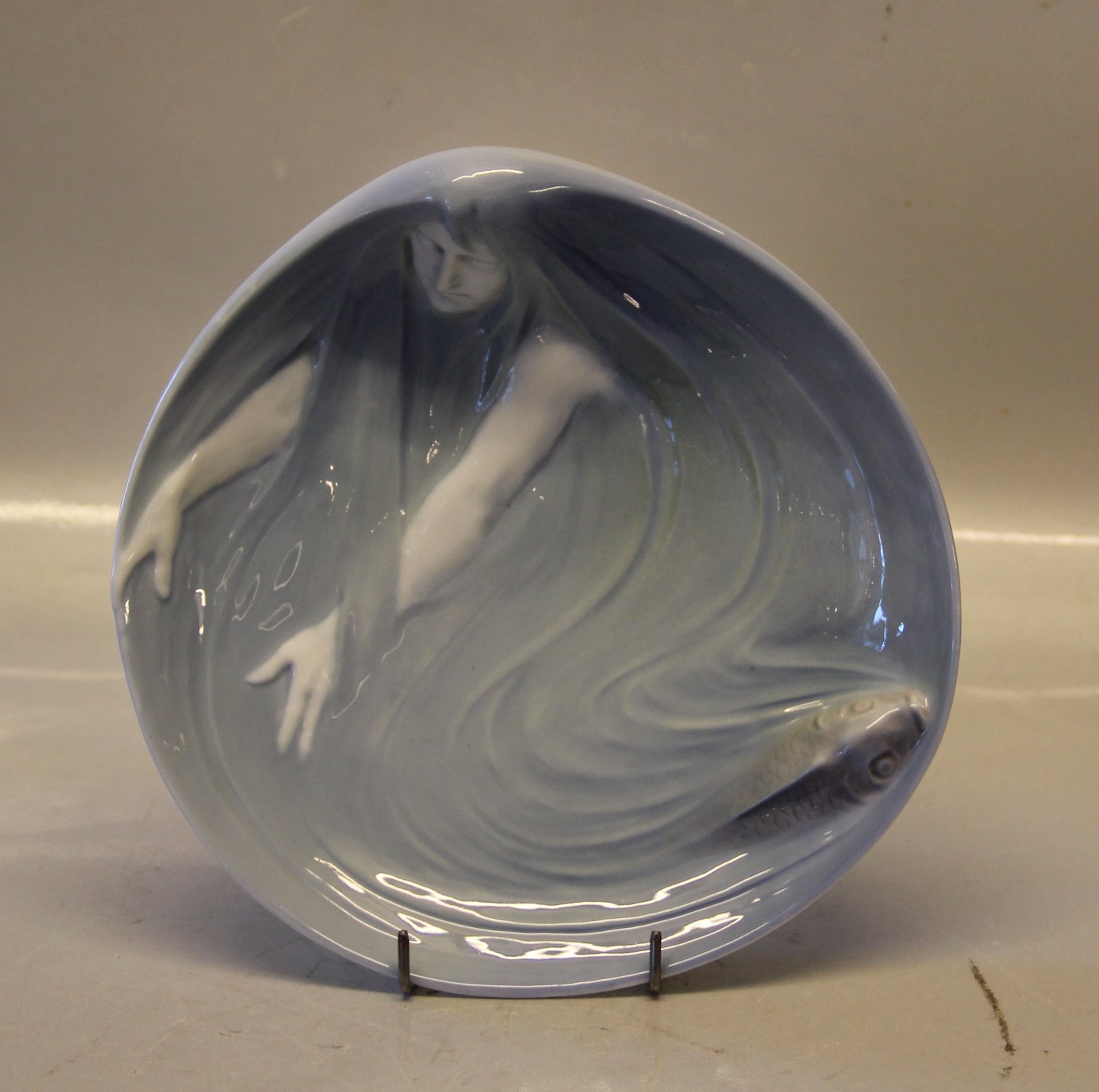 Beskrivelse: Kgl. tidligt Art Noveau skål 495 med en person der jagter en fisk i sivene 22 cm 003 fra Royal Copenhagen Malernr 114 eller 117 I hel og fin stand Agnethe og Havmanden eller den lille havfrue eller den stygge Ursula