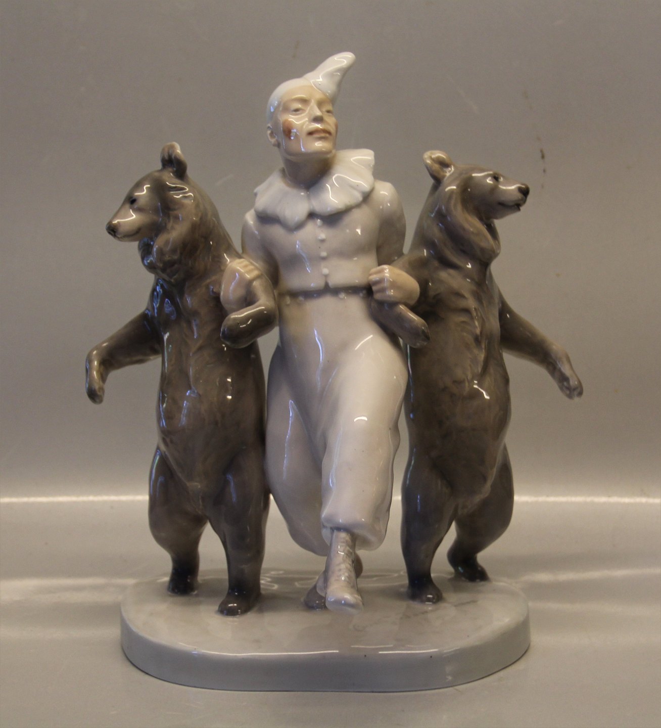 Beskrivelse: Kgl. 330 Kgl. Klovn og 2 Dansende bjørne 30 x 25 cm Signeret Carl. J. Bonnesen 1899 CJB fra Royal Copenhagen 1. sortering I hel og fin stand men med sædvanlige støttemærker under bjørnes "arme" se billeder