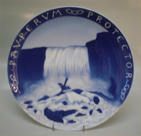 Beskrivelse: Old Fellow Ordenens hospital på Island. Skogafors, i forgrunden halvt skjult i vandet en drage gennemboret af kårde, hvis parerplade er danned af tre ringe (samme som 14, 28, 29, 30) Indskrift: PAVPERVM PROTECTOR ( de fattiges beskytter) Design: Arnold Krog 28 cm