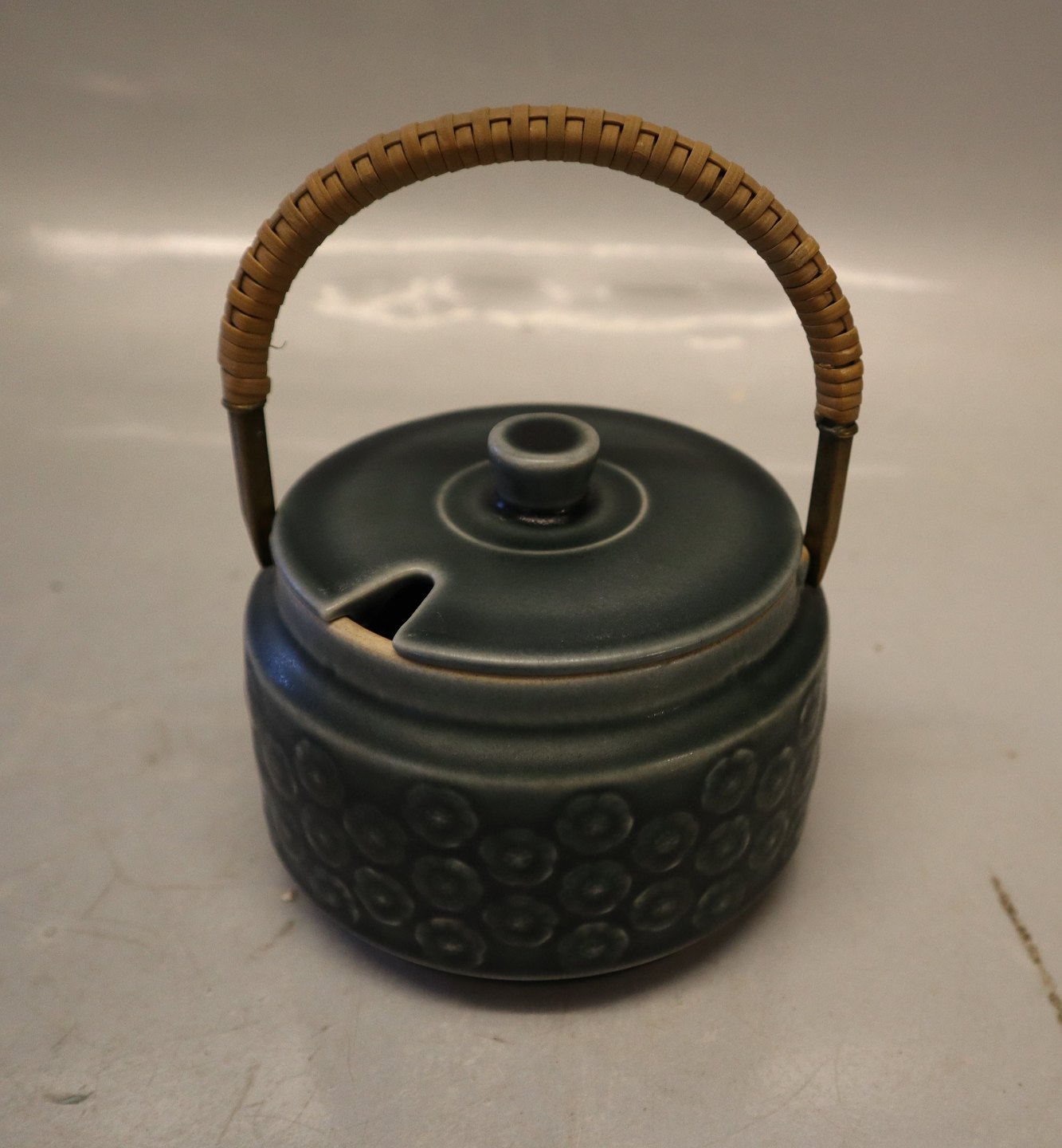 AZUR 523 Marmeladekrukke 7 x 10,5 cm og basthank Quistgaard Nissen Kronjyden stentøjsstel. I fin og hel stand. Stemplet Kronjyden eller Bing & Grondahl Copenhagen Stoneware: Designet for Kronjyden, Nissen B&G af Jens Harald Quistgaard IHQ