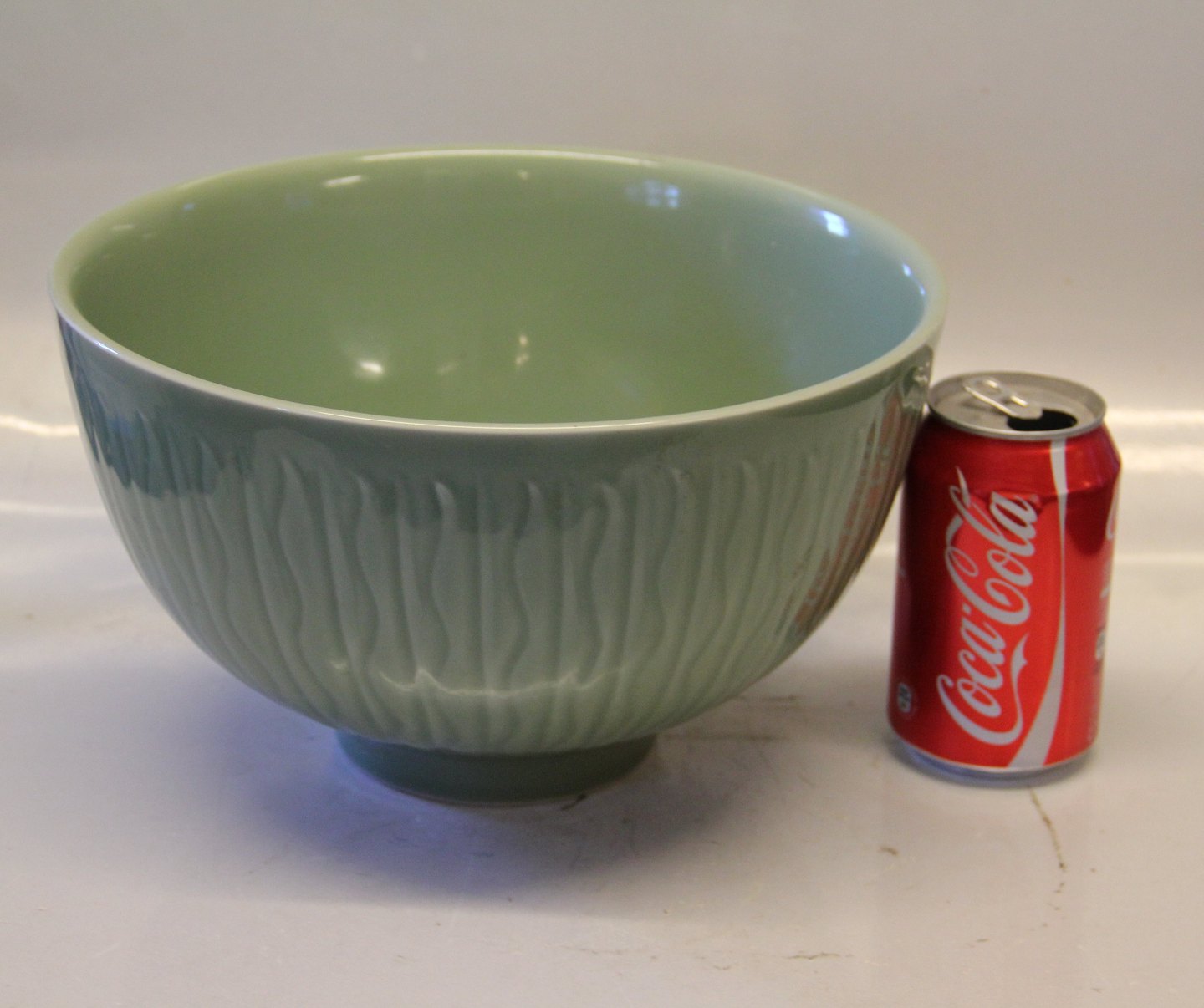 Beskrivelse: Royal Copenhagen stentøj 21430 Kgl. Skål riflet 15.5 x 26.5 cm Celadon glasur Gerd Bøgelund januar 1957 I fin og hel stand
