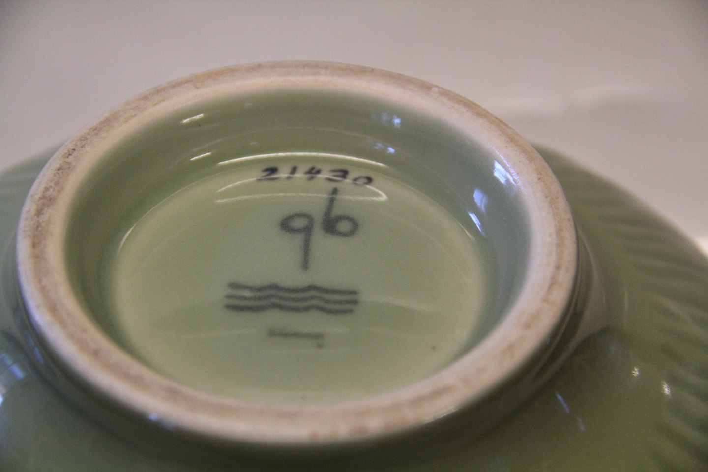 21430 Kgl. Skål riflet 15.5 x 26.5 cm Celadon glasur Gerd Bøgelund januar 1957