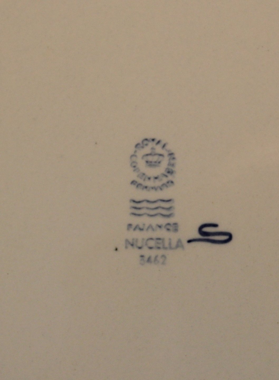 Nucella Aluminia Fajance Nucella Stelform 1589 V.T.N af Inge-Lise Kofoed og Leif Lautrup-Larsen. 1966 Dekoration: Nucella af Ellen Malmer - blå eller brungule farver - fra 1969 Baca dekoration Royal Copenhagen Fajance
