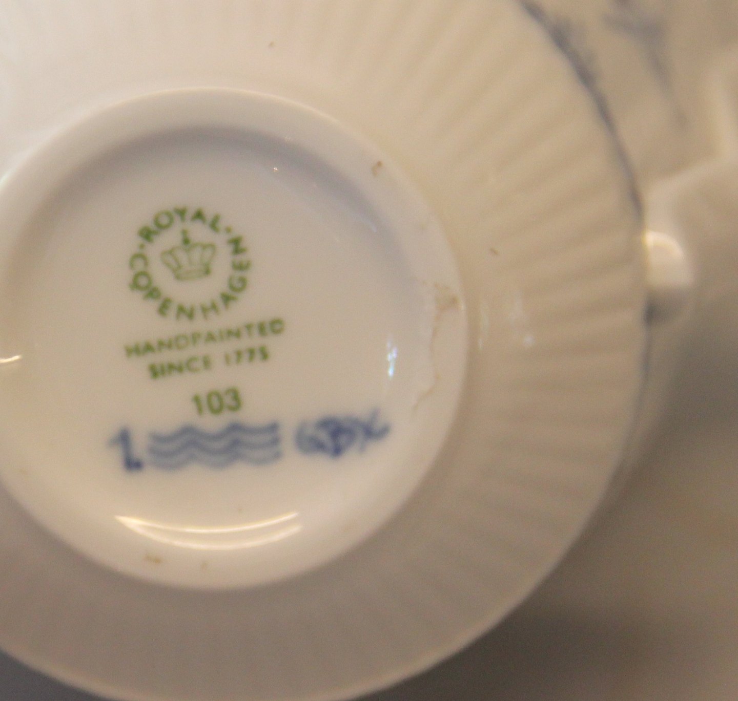 103-1 Krus med hank 10 x 9 cm 37 cl (1016752) Royal Copenhagen Musselmalet riflet . Muselmalet I fin og hel stand. Passer godt sammen med andre blåmalede spise- og kaffestel