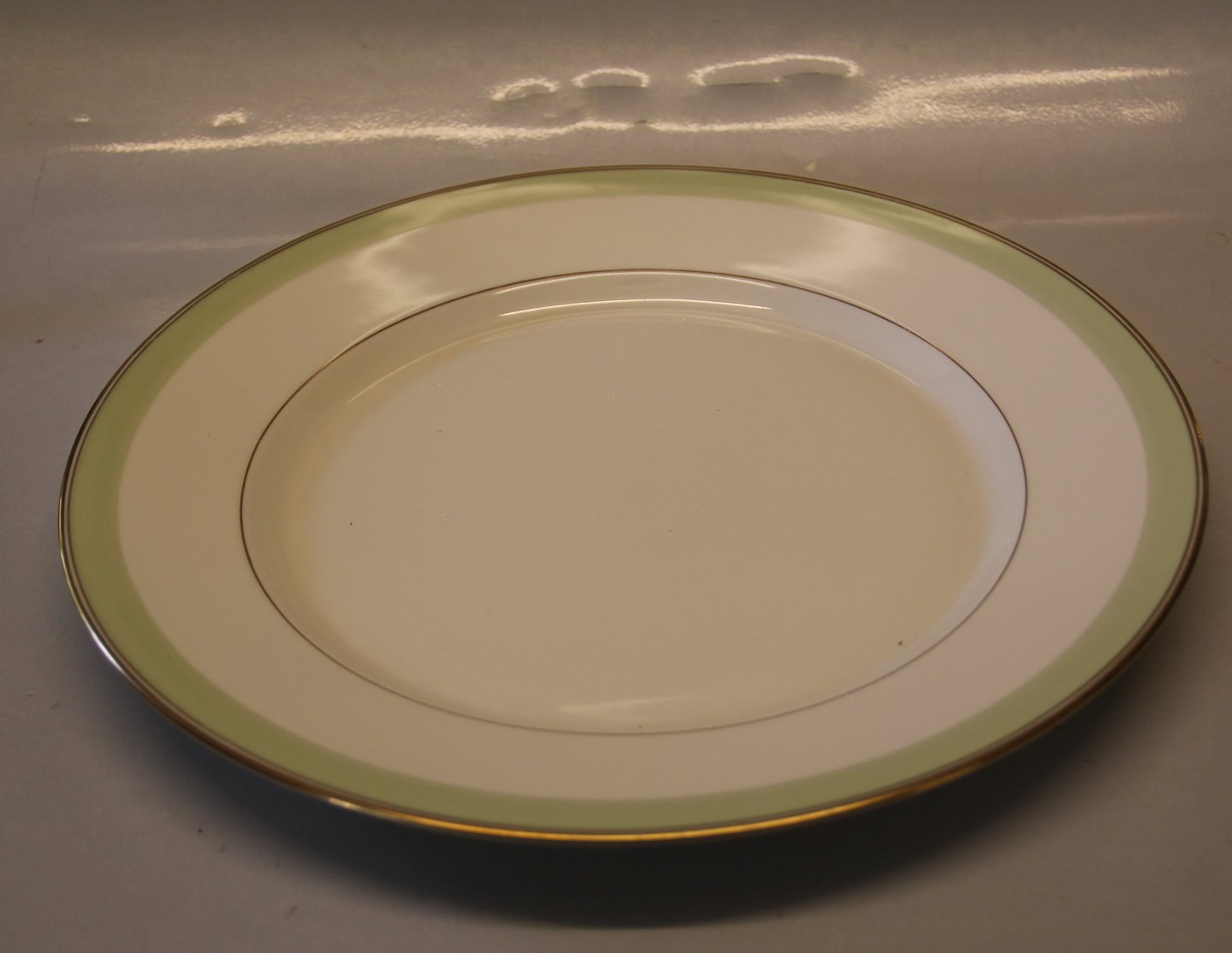 9732-1236 Fad, rundt 34 cm Broager #1236 Kongelig porcelæn Kgl. spise- og kaffestel fra Den kongelige Porcelænsfabrik Grøn på creme porcelæn med guldkant. Af Torkild Olsen TO som også skabte Dagmar