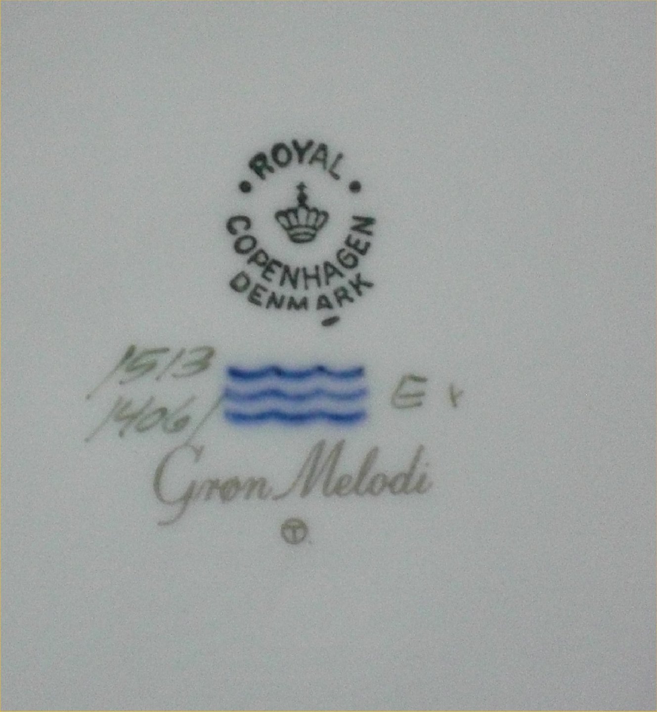 1513-14061 Tallerken 22,5 cm Grøn Melodi #1513 (Kgl.) Rillet form, hvid glasur, grøn dekoration, grønt båd og guldfilet.