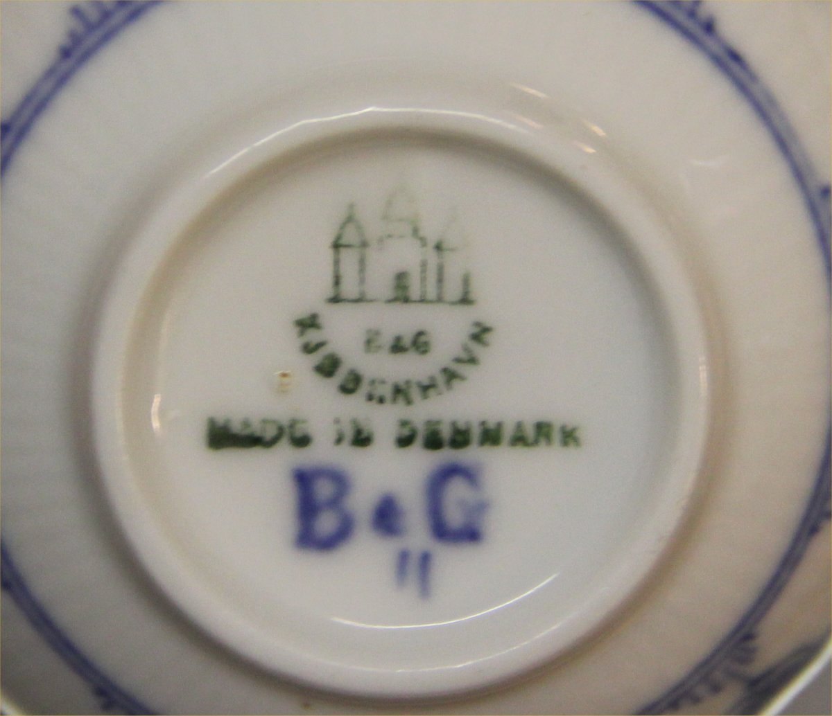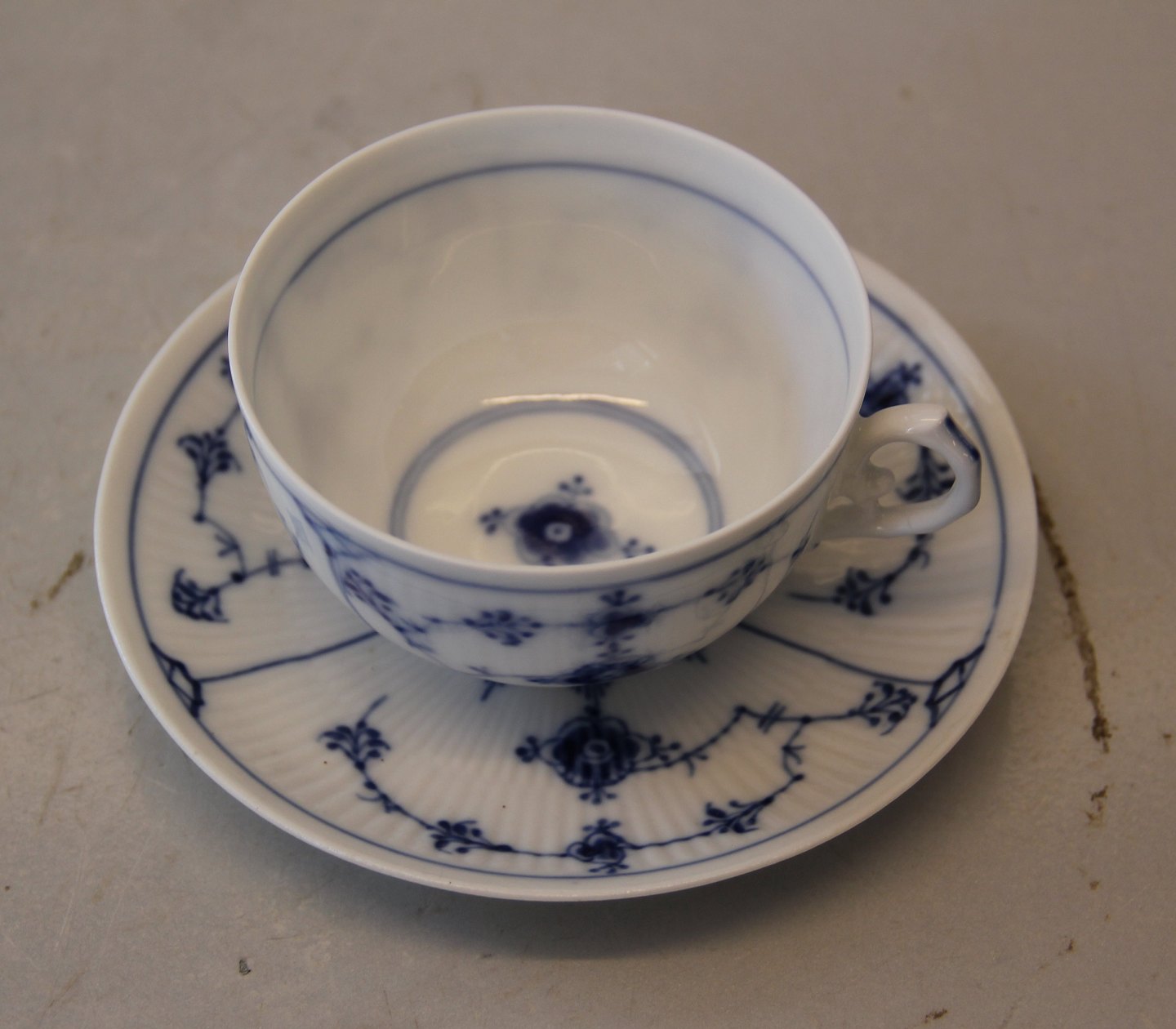 Antik Riflet Kaffekop med blå blomst inden i bunden 4.8 x 8.2 cm (112?) med underkop 12,8 cm Riflet B&G Blåmalet, Musselmalet